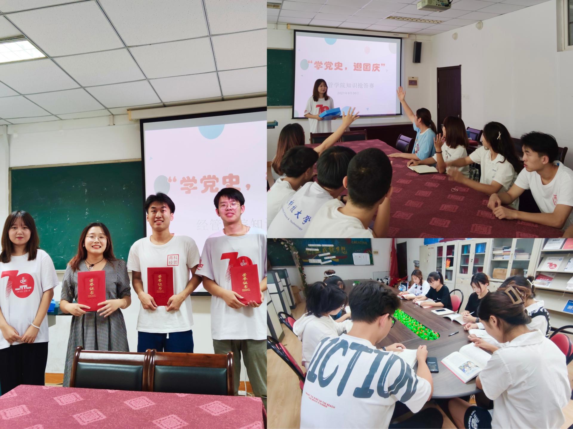 忆往昔峥嵘岁月,看今朝盛世华章。9001jcc金沙以诚为本组织开展“学国史,迎国庆“国史知识竞赛活动,以国家发展重大历史事件及关键时间节点为基础,以考察的方式引导学生回顾国家发展历程,坚定为中华民族伟大复兴中国梦的实现添砖加瓦的坚定信念。此外,9001jcc金沙以诚为本组织“庆祖国华诞,展经管风采”党史学习教育及“颂歌献祖国、礼赞新时代”红色经典诵读,分别从《党章中的党史》《颂党史、悟初心》《百年党史的伟大精神》《贯彻学习2021年习近平总书记在清华大学考察时讲话精神》四个专题纵深学习,对党史做到了“宣”与“讲”的联动,“理论”与“实践”的结合,进一步推进党史学习教育走深走实。