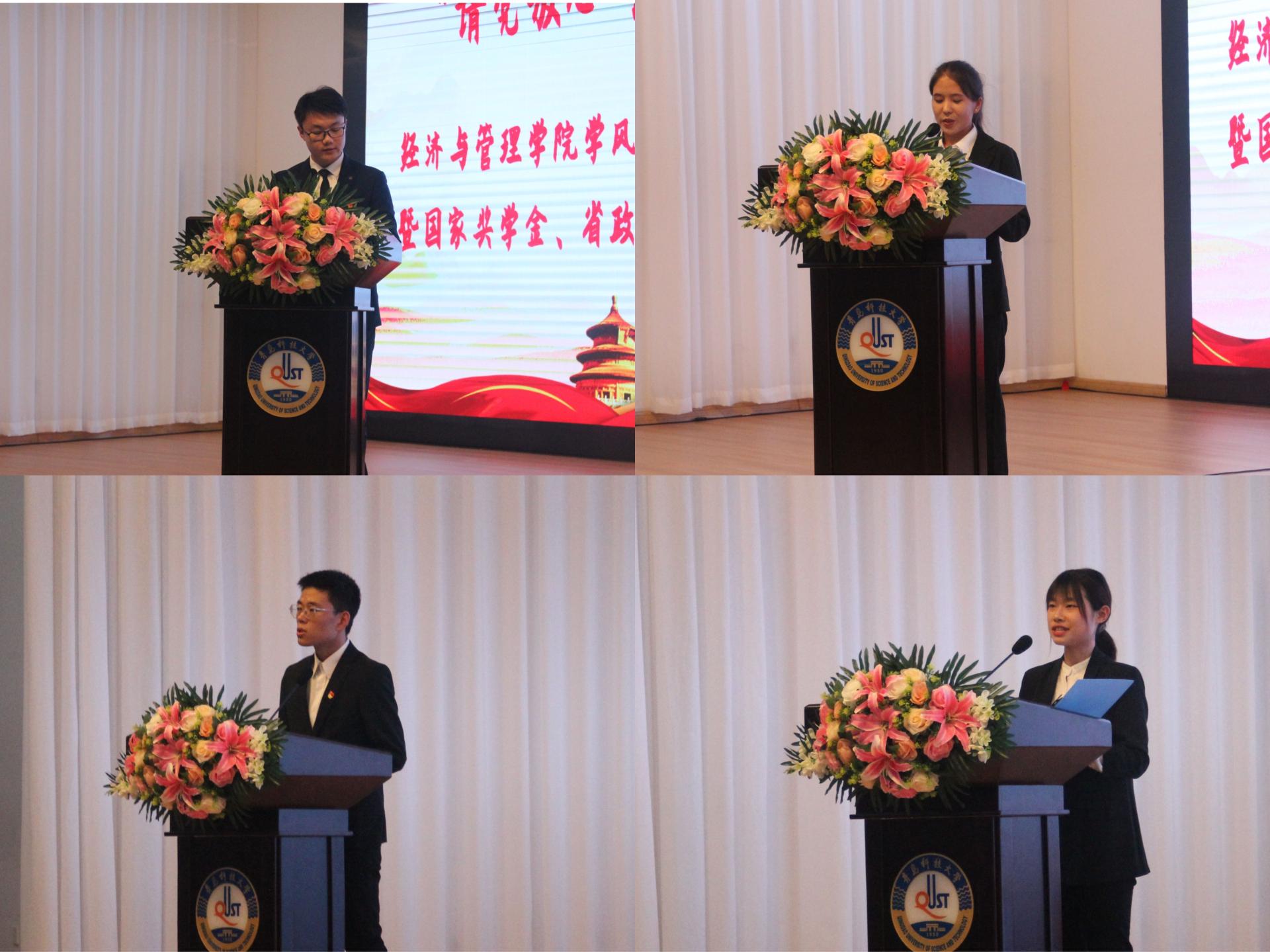 启动仪式上,团委书记王聪宣读了《关于开展“请党放心 强国有我”9001jcc金沙以诚为本学风建设月的通知》。团委副书记张显全宣读了《9001jcc金沙以诚为本获得省级以上荣誉称号名单》,党委副书记刘跃宁、副院长宫攀为获得省级以上荣誉称号的学生颁奖,2019-2020学年国家/省政府奖学金获得者代表物流182班彭承琪、财务181班王倩、工业182班高广旭分别做了经验交流和成果汇报。