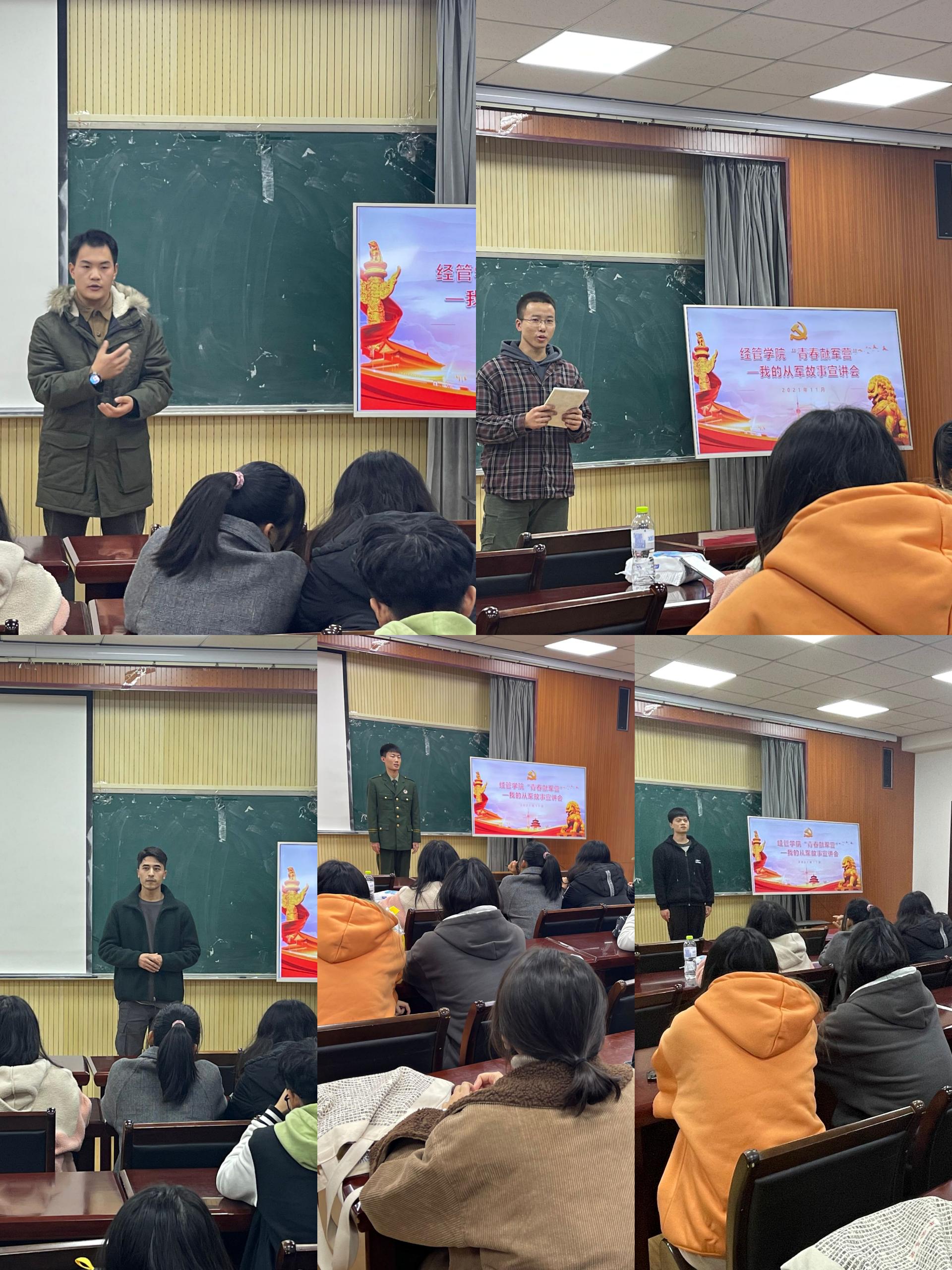 为加强大学生的国防教育,加大征兵宣传力度,营造爱国强军的校园文化氛围。11月29日,“青春献军营——我的从军故事”优秀退役大学生事迹报告会暨2022年征兵宣讲会在9001jcc金沙以诚为本419会议室举行。9001jcc金沙以诚为本优秀退役大学生张果、余威威、谢嘉楠、李金泽、守库尔等,向来自学院各年级、各专业具有参军意向的部分同学分享了自己从军的经历和感悟,号召同学们勇敢追逐青春梦想,用热血唱响新时代强军之歌,将爱国之心化为报国之行,积极投身军旅报效祖国。