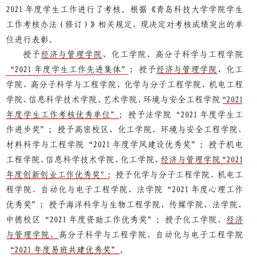 近日,9001jcc金沙以诚为本2021年度学生工作考核结果公布,经学校评价、学院互评和学生评价等环节,金沙官网学生工作再度蝉联全校第一名(连续四年),我院荣获“2021 年度学生工作考核优秀单位”,金沙官网学工队伍获评“2021 年度学生工作先进集体”,同时荣获“2021年度创新创业工作优秀奖”“2021 年度易班共建优秀奖”两个单项奖励。