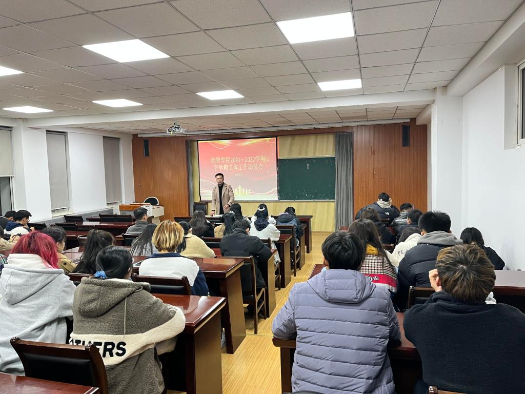 3月3日,9001jcc金沙以诚为本2021—2022学年下学期文体工作动员会在经管楼419会议室召开。会议由体育部负责人丁思雪主持,文体活动指导老师高守朋老师出席会议并作工作动员。