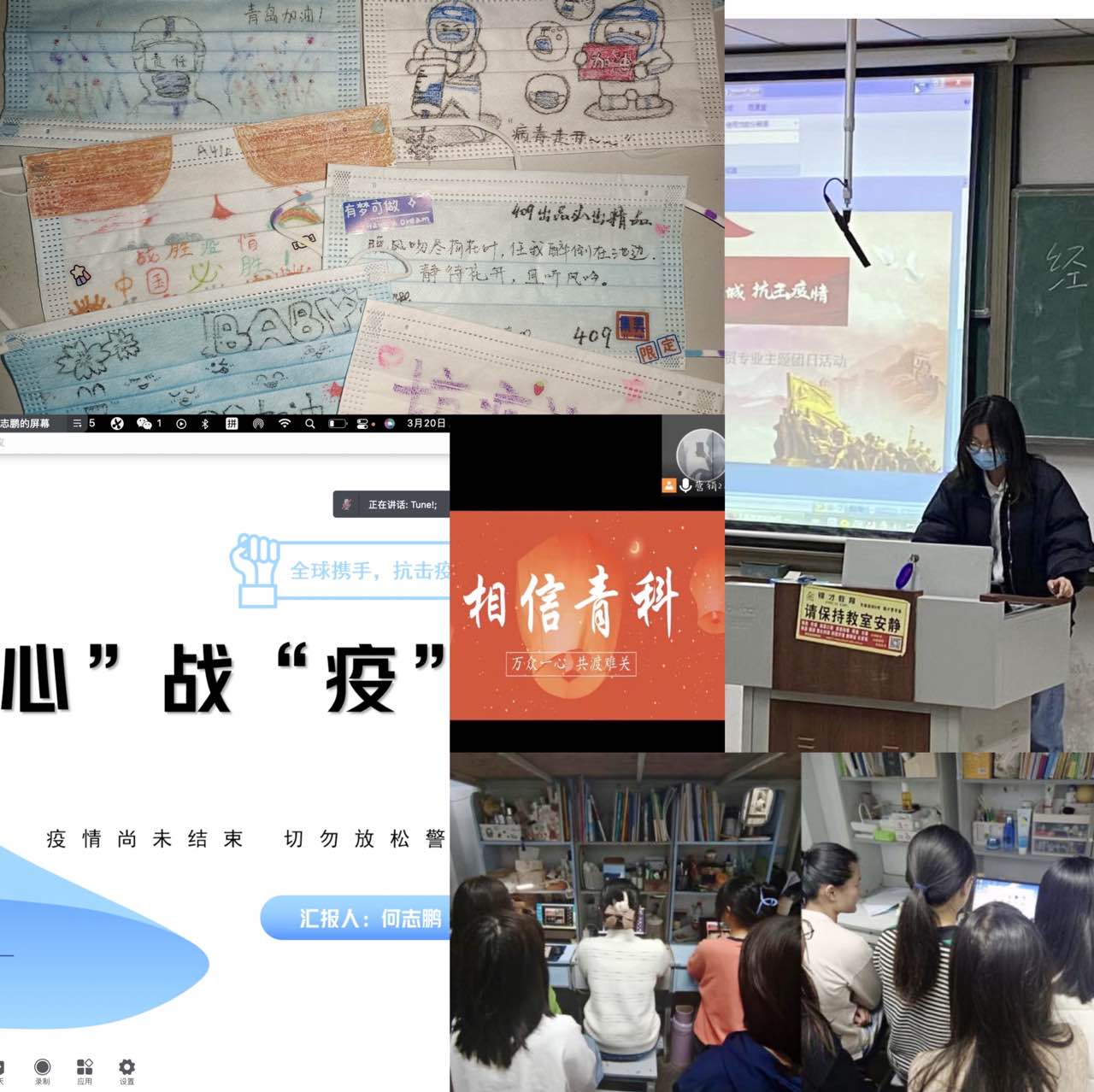 各专业团支部以共抗疫情为主题,围绕疫情防控开展主题团日活动。工业工程专业团支部积极响应学校和学院号召,以“最美志愿者”为主题开展团日活动,全体团员主动请战参与疫情志愿服务,主动牺牲休息时间,加入核酸检测志愿者的大军,当起了秩序组织员、管理引导员、设备操作员。一张张阳光的笑脸,一个个青春的身影,广大志愿者同学们冲锋在前、甘于奉献,彰显出经管学子的靓丽底色,为核酸工作的高效、有序完成贡献了青春力量。工商管理专业团支部以“花样抗疫”为主线,进行DIY创意口罩活动。全体成员以宿舍为单位,将普普通通的口罩通过绘画,贴纸,祝福语等形式进行美化。每一幅作品都是独特的,旨在寄托同学们抗击疫情的决心,加强同学们的疫情防控纪律,丰富学生的课余生活,并鼓励同学们保持良好心态,乐观应对疫情。城市管理专业团支部、工业工程专业团支部积极响应学校号召,本着不聚集、强防护的原则,线上线下同步开展观影活动。团支书首先通过ppt展示,给大家科普当前疫情防控形势、注意要点等相关知识并集中观看《中国战疫纪》纪录片,让同学们深刻明白人人都是抗击疫情的行动者,人人皆有爱,就能让病毒无处遁形。市场营销专业团支部通过腾讯会议召开“同心战‘疫’,共克时艰思想宣传教育”主题团课,进行了防疫、自我管理、心理调适、传播正能量等方面的教育引导,鼓励学生与学校一起,齐心协力,战胜疫情。活动结束后,团员青年们纷纷表示要树立疫情防控安全意识,积极配合校园防疫工作,凝聚集体意识,坚决抗击疫情。