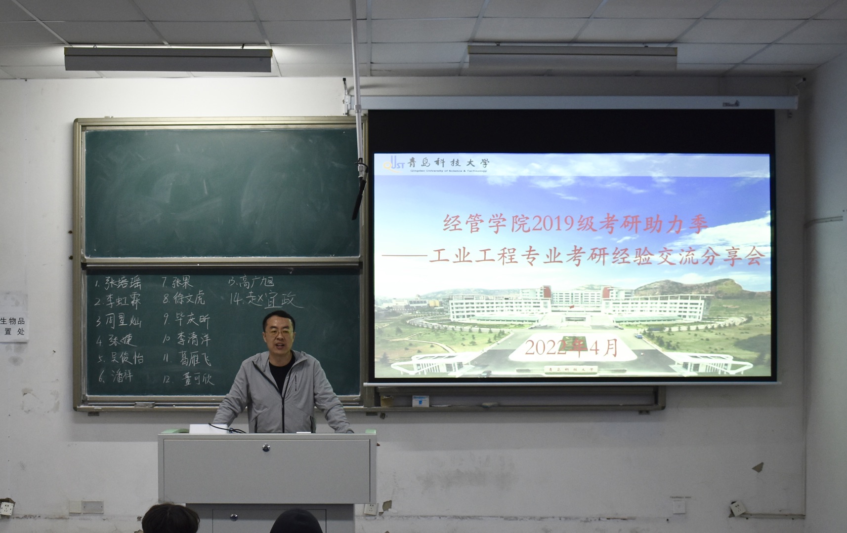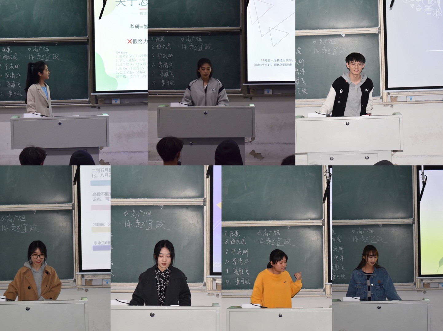 于龙振首先肯定了2018级学子优异的考研成果,对考研数据进行分析(14人成功升硕,国内升研率达到30%),并为低年级学子做动员树立考研信心。随后2018级的14位成功升学的学生全部到场,并根据自己的实际经验从不同的方面多个角度依次分享自己的考研心得。
