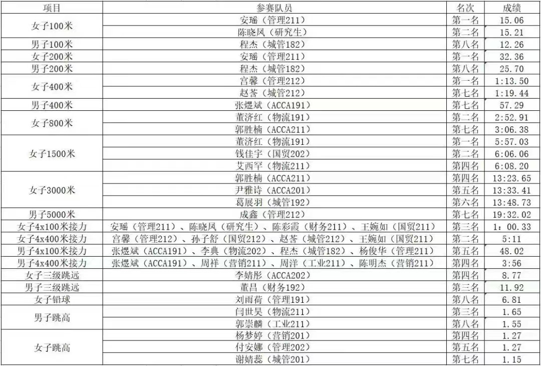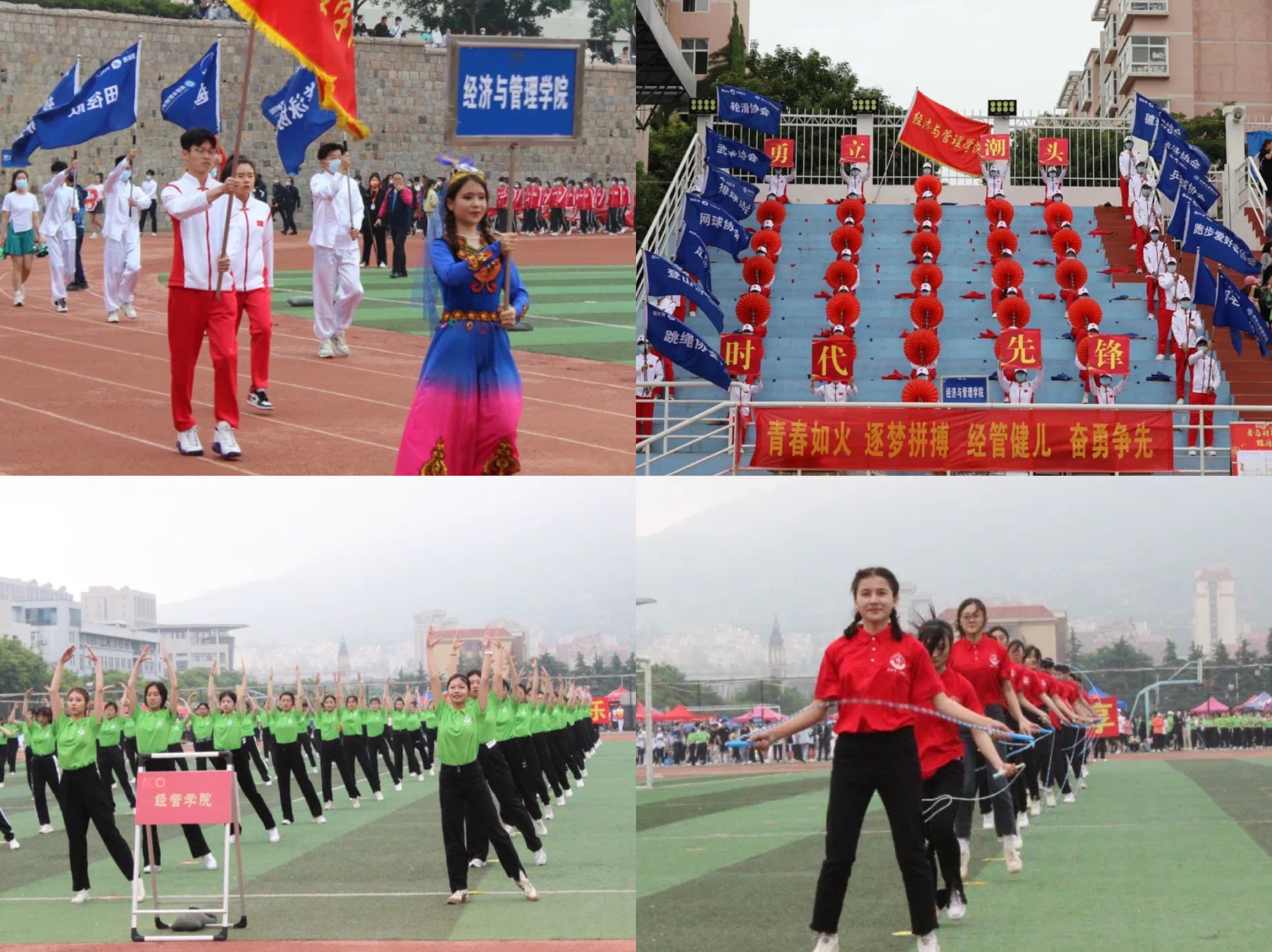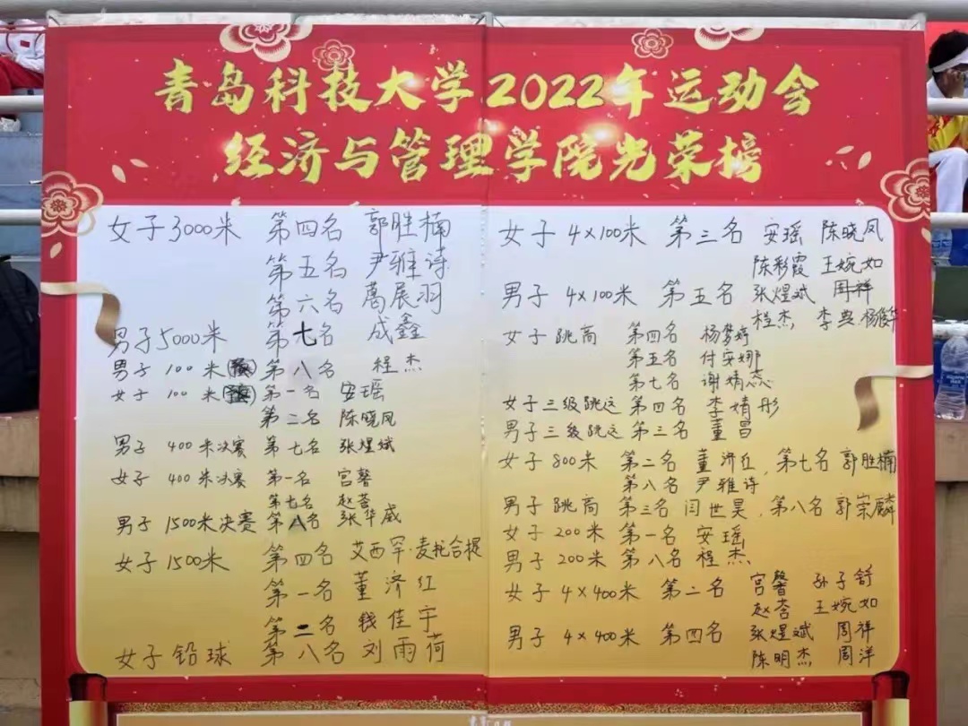 赛场上,经管学子充分展现了勇立潮头、敢为人先的精神风貌和顽强拼搏、超越极限的体育精神,以超强的团队凝聚力与战斗力,荣获多个奖项:学生女子组团体总分第二名(崂山校区第一名)、学生男子组团体总分第六名、排舞比赛二等奖与精神文明奖等四项荣誉,其中,学院田径队在女子组中实现新突破,充分展现了经管学子昂扬向上、团结拼搏的精神风貌。