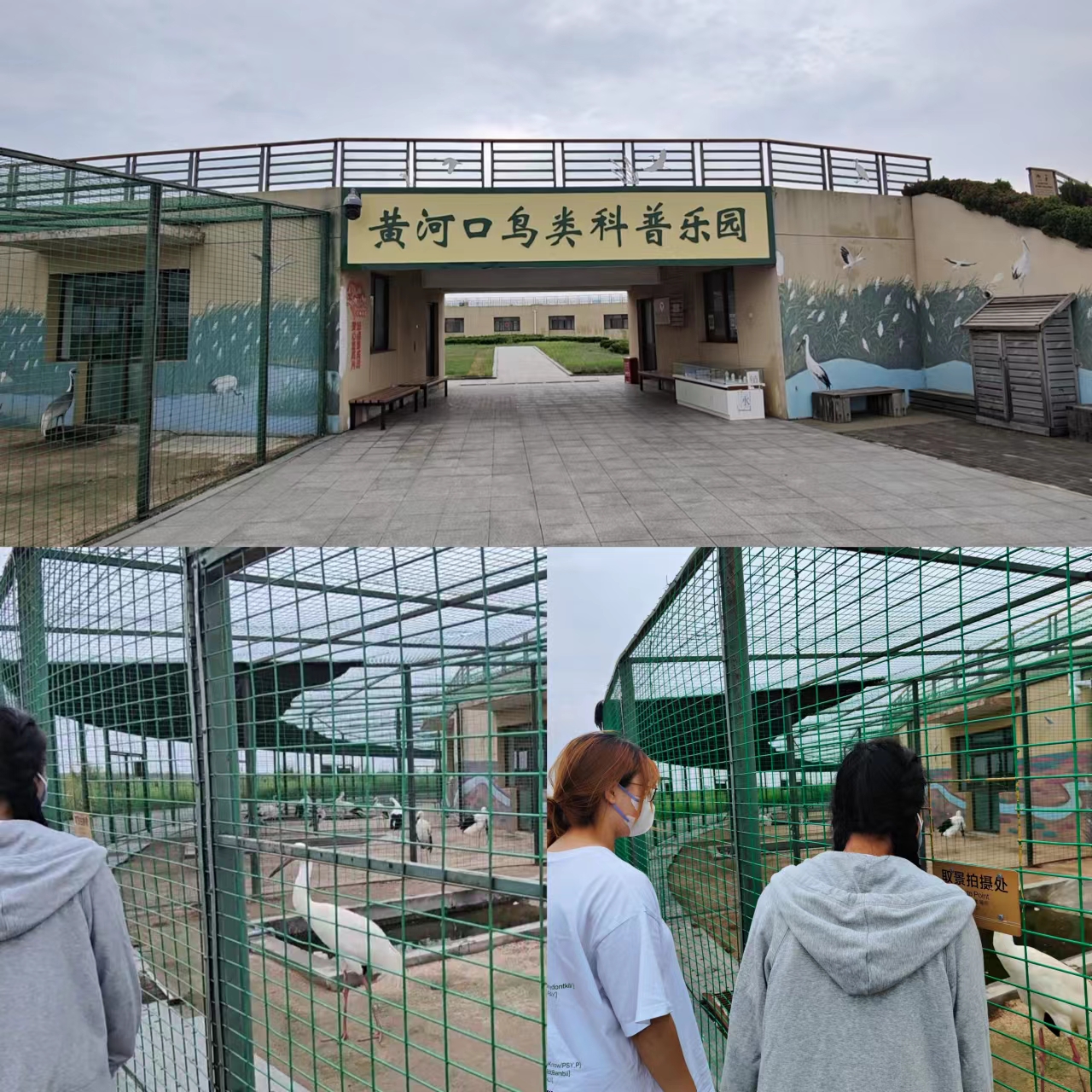 在原名为“鸟类救助中心”的“黄河口鸟类科普乐园”中,实践团成员与这里受保护的鸟儿来了一次近距离接触。为了让游客对保护区鸟类有进一步认识,科普乐园每天会有鸟类放飞表演,因此实践队有幸看到了蓑羽鹤和东方白鹤优美的飞翔姿态。在饲养员的一声令下,几只蓑羽鹤飞出,它们排着队,在科普乐园附近盘旋,它们时而高飞,时而舒展翅膀,与背景中的芦苇丛交相辉映,在场的所有人不禁发出惊叹,并纷纷拿出手机录像记录,毕竟,这样一次特殊的见闻,值得每个人好好珍藏。