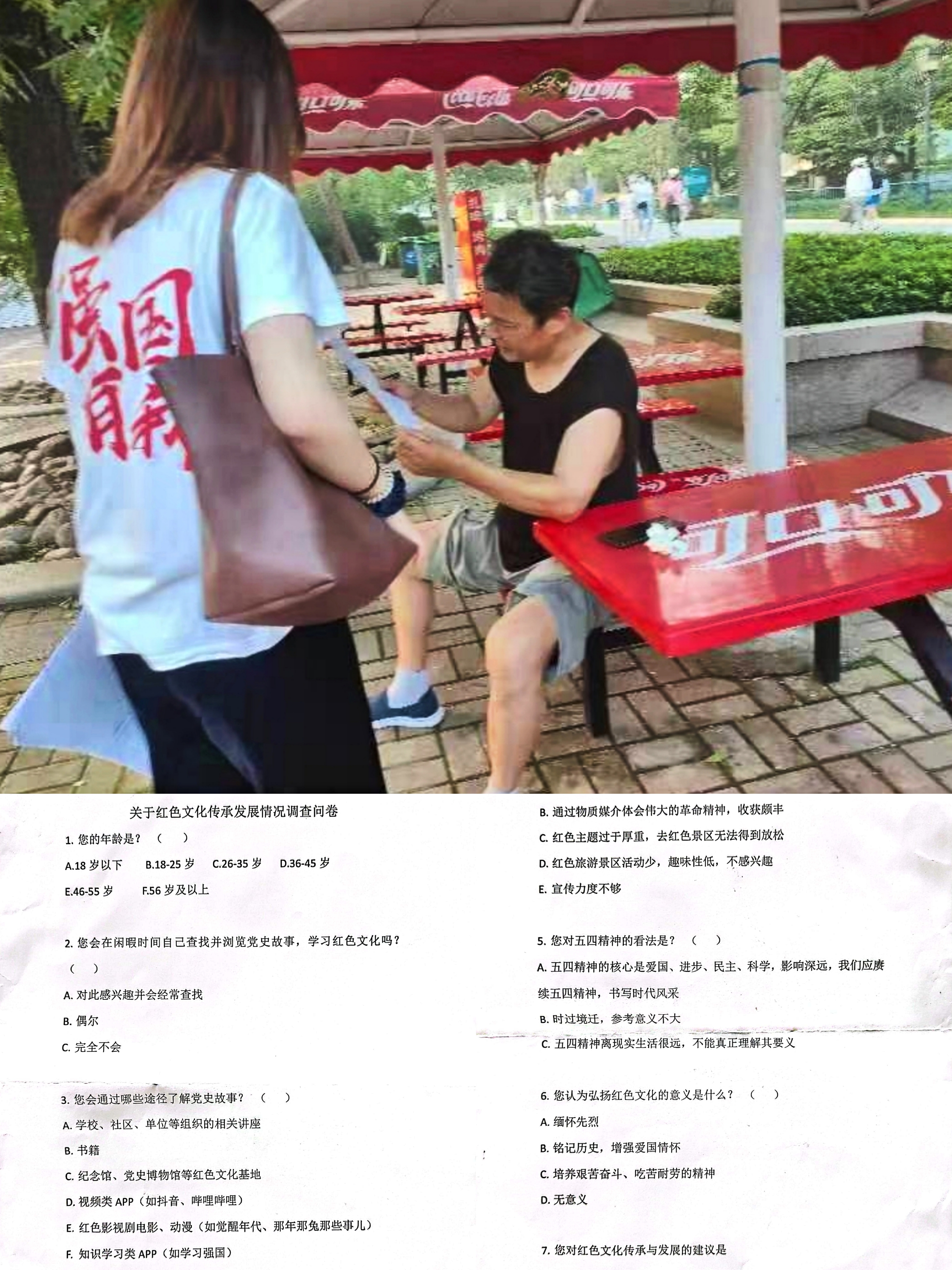 随后,为了深入开展红色文化传承等的调查,团队成员带上前期准备好的调查问卷,随机邀请公园里的市民与游客填写调查问卷,了解相关情况。一位入党三十余年的爷爷给团队成员留下了最为深刻的印象。当提及当前红色文化传承遇到的问题时,爷爷犀利的指出:“最大的问题就是现在的年轻人没有亲身经历过曾经的困难时期,对现在的美好生活的来之不易没有那么深的感触,像我们这样的老人,是最尊重理解咱的红色文化的了。“谈到兴起,爷爷甚至考起了团队成员红色文化的相关问题如毛泽东同志的执政路线等,更让团队成员意识到了自身红色文化的薄弱与陌生,对红色文化传承之路的艰难有了更深的了解。临走前,爷爷殷勤叮嘱团队成员一定要多看书多学习,在红色文化的熏陶下要成为一个对社会更有用的人。
