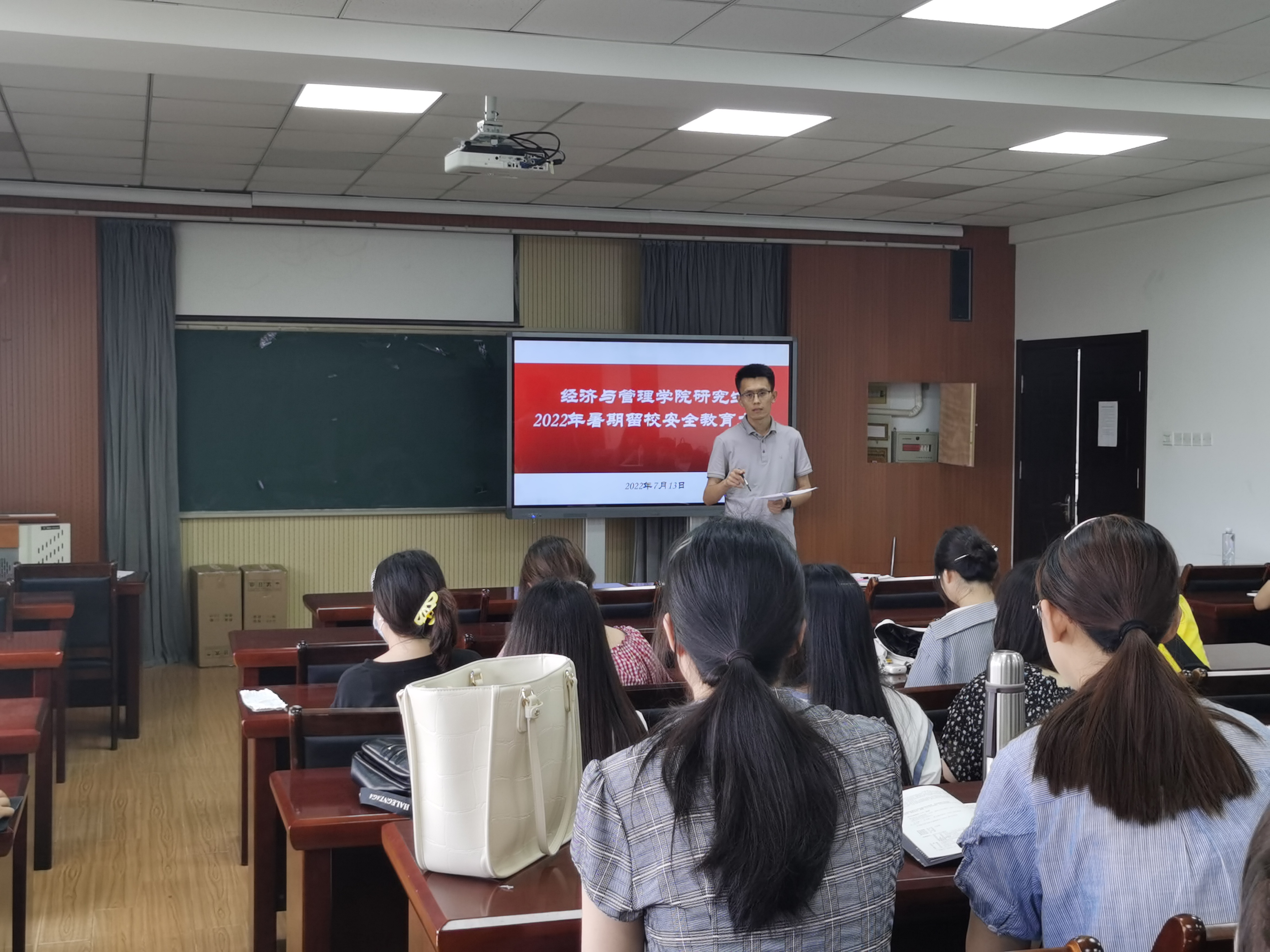 为切实做好2022年暑假留校学生疫情防控工作,确保留校学生身心健康,保障校园安全稳定。7月13日下午,9001jcc金沙以诚为本在经管楼504会议室召开研究生2022年暑期留校安全教育大会,学院全体留校研究生参加会议,会议由学院学工办副主任兼团委副书记张显全主持。