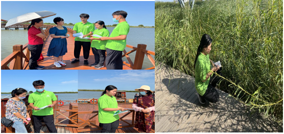 追寻着总书记的考察足迹,团队成员先后来到黄河三角洲国家级自然保护区、黄河入海口、孤岛万亩槐林湿地、黄河口摄影展等旅游景点,并实地参观黄河故道沿途状况。这里飞鸟云集、水鸟嬉戏、黄河入海、沁人心脾的草色清香令人心旷神怡。漫步在万亩槐林间,走过胡耀邦书记看望青年团员们时走过的路,领略“劈开荆棘建新舍,定教荒岛变绿洲”的青年力量。凭栏眺望,我们看到生态保护和高质量发展的答卷在这里书写,感受到湿地生态涵养能力显著提高,体悟到总书记“爱之深,则为之计深远”的殷殷厚望。