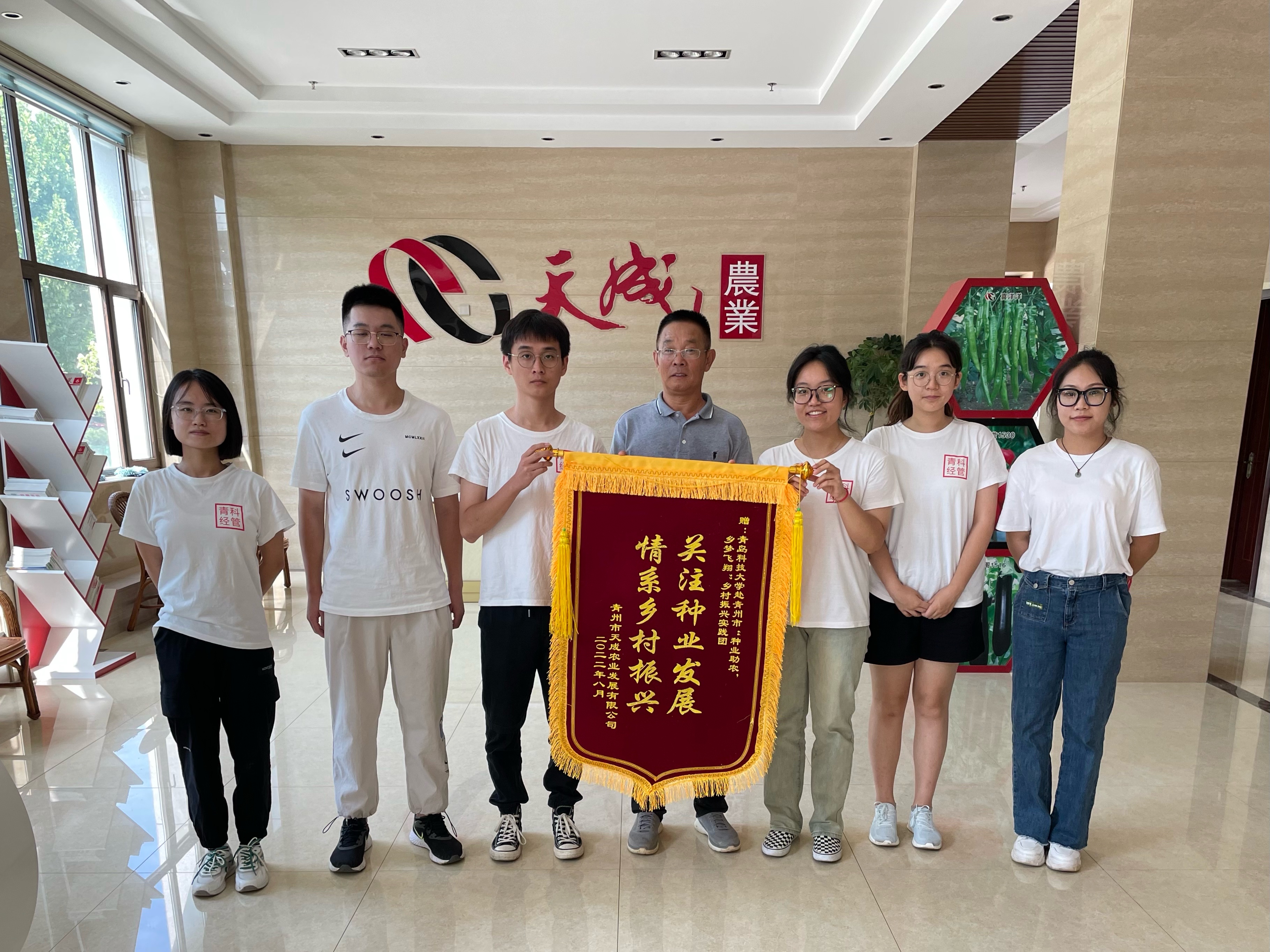 最后队员们走进青州市天成农业发展有限公司进行深入调查研究。青州市天成农业发展有限公司作为青州市益都街道扶贫大棚重点建设项目,在当地乡村振兴战略实施过程中有着举足轻重的地位。该项目投资350万元购置全钢架温室大棚5个、钢结构拱拱棚27个、1个智能连栋大棚及其配套附属。确定10个村的享享受政策(或即时帮扶)户作为项目扶持对象,共112户,22828人。队员们在程永国董事长的带领下,参观了种子研发中心,并且亲自走进大棚,详细了解种子育种的相关过程。在座谈会上,通过研发部范丽娜经理的讲解,以及对队员们问题的仔细回答,队员们了解到本公司一直坚持科技助力智慧农业发展,拥有8000余平方米的种子研发中心,800余平方米的种子营销中心,公司实验室内有众多高科技研发设备,助力种业研发。公司还主张科学管理助力项目发展。公司积极引进国内外人才,现有员工52名,其中科研人员18名,包括博士3名、硕士7名,韩国育种家4名,国内科研院所合作专家8名,目前,建成山东省院士工作站,山东省引才引智示范基地、潍坊市辣椒首种工程技术研究中心等研发平台。公司致力于科技创新,培育推广优势蔬菜新品种,以蔬菜高产优质、降低生产投入成本为目标,搭配科学化的栽培管理措施,以促进农民增产增收、改善种植环境,实现农企共赢,积极推进乡村振兴战略。程董事长还向队员们赠送了“关注种业发展,情系乡村振兴”的锦旗,对队员们心系种业发展,助力乡村振兴表达谢意。