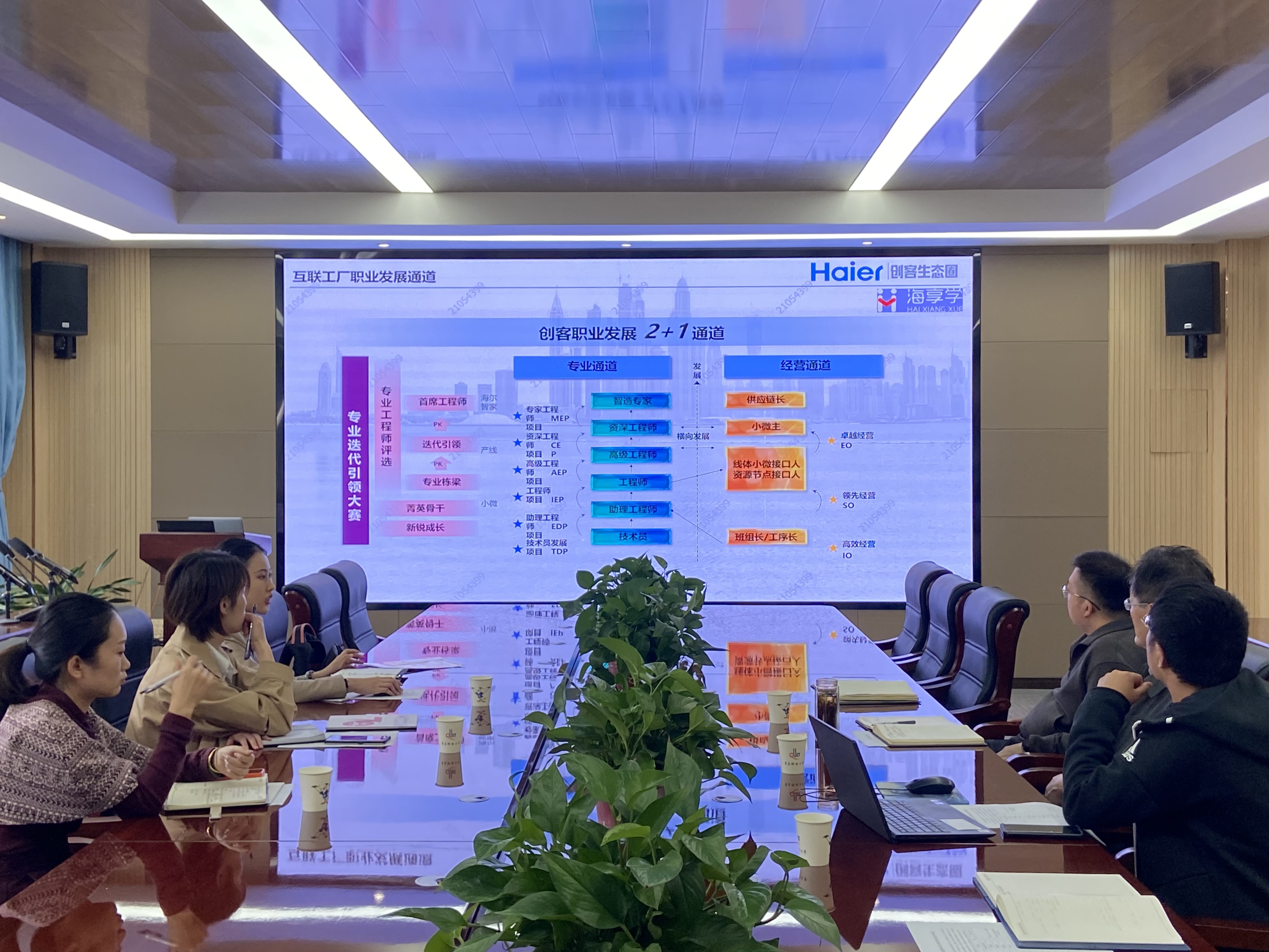 王欣、矫雅囡围绕海尔智家卓越工程师发展计划(PEDP)的具体实施方案进行了详细介绍,就校企合作、用人需求、招聘计划等事宜展开交流,同时高度赞扬了在企学子的综合素质和专业水平,表达了进一步加强校企合作的良好愿望。学院对用人单位提出的想法进行了回答,切实促进了校企供需对接,为后续推动学院学生从实习到就业“无缝对接”及校外实习基地建设等合作打下了基础。