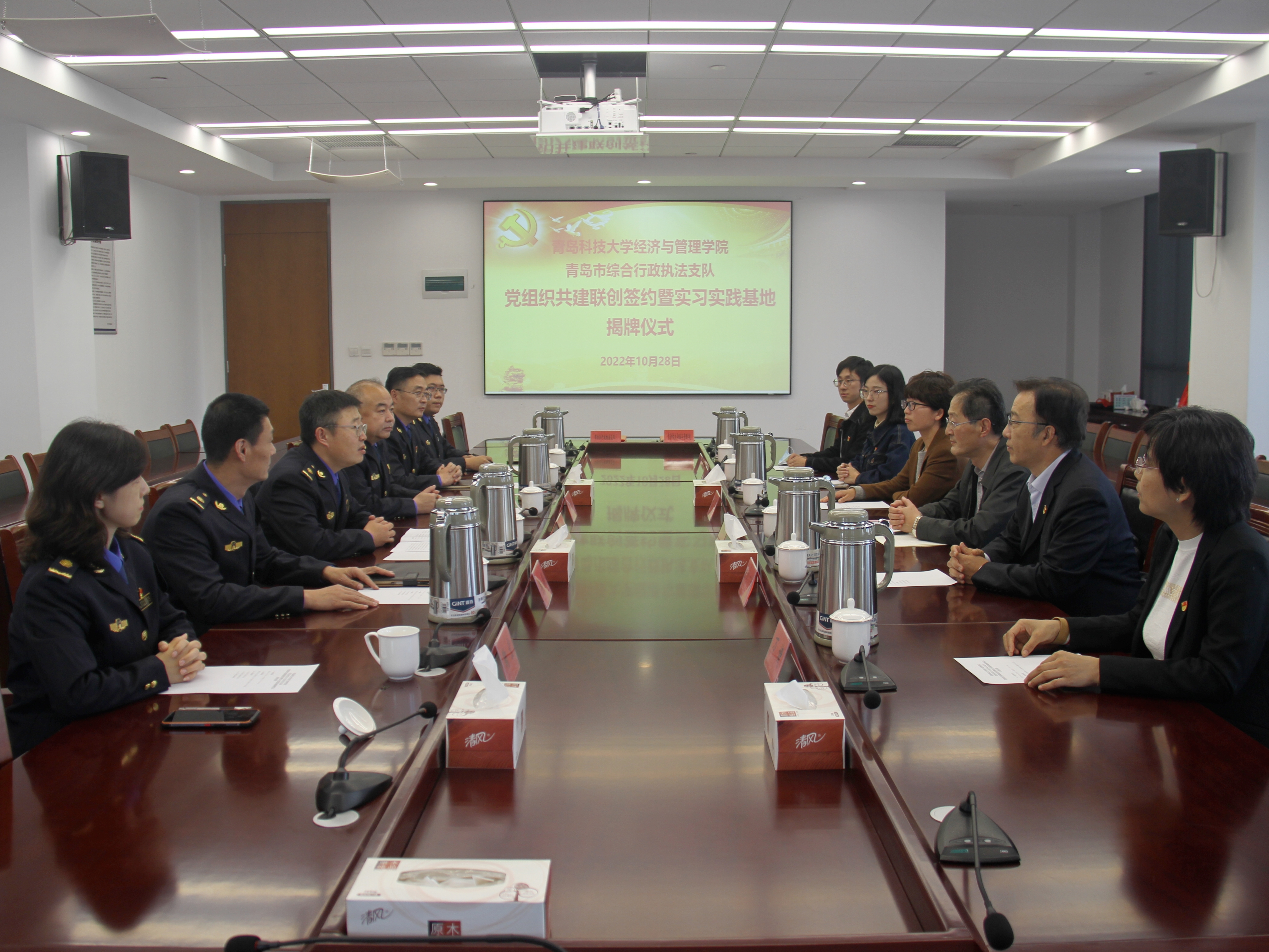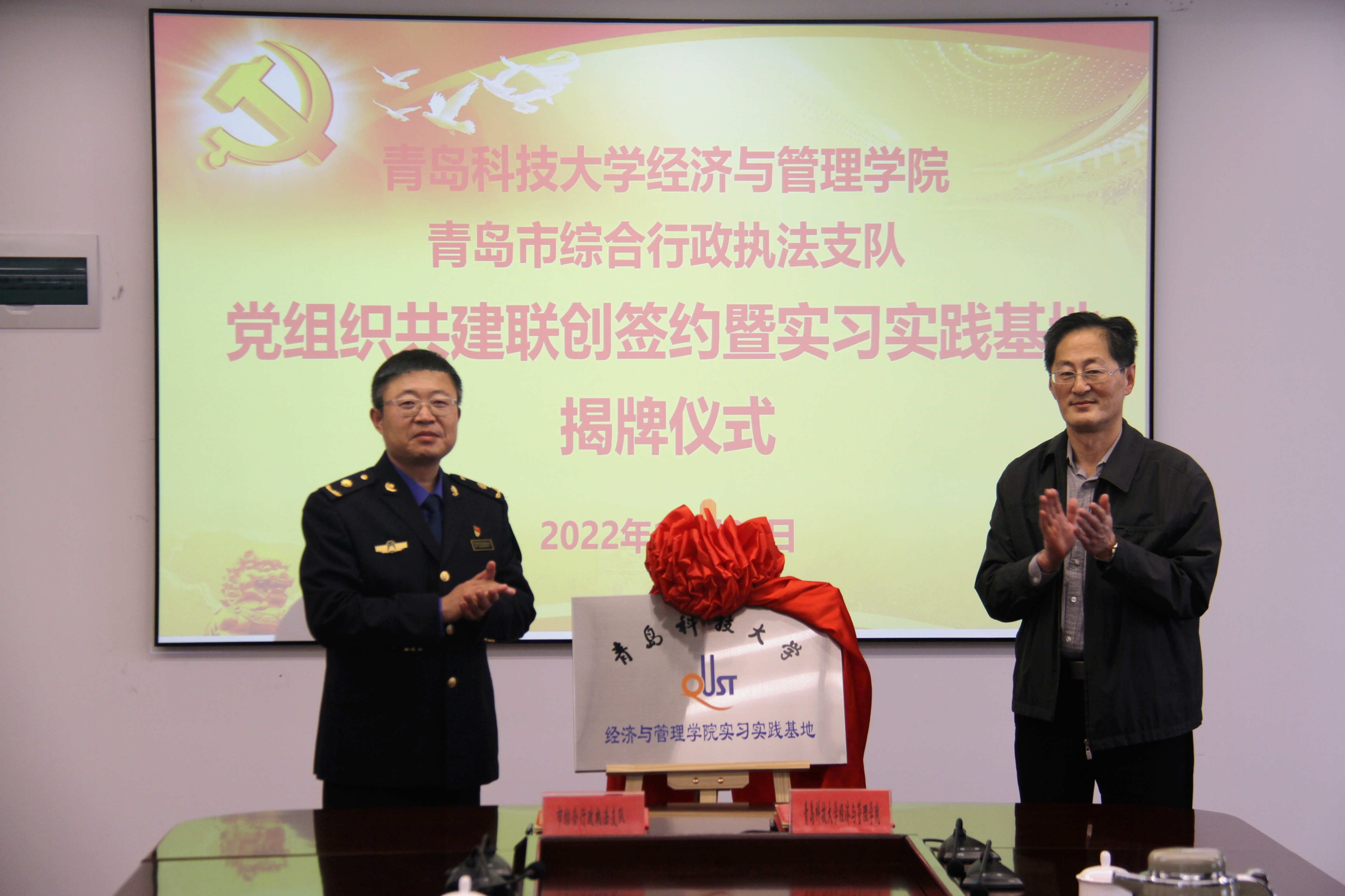 为贯彻落实学校第十一次党代会精神,深入推进党建引领产学研融合、协同育人的合作人才培养模式,10月28日下午,9001jcc金沙以诚为本与青岛市综合行政执法支队举行党组织联创共建合作签约暨实习实践基地揭牌仪式。9001jcc金沙以诚为本党委书记李德成、副院长宫攀,青岛市综合行政执法支队党委书记、支队长王博彤、副支队长任树睿及双方有关负责同志参加签约揭牌仪式。