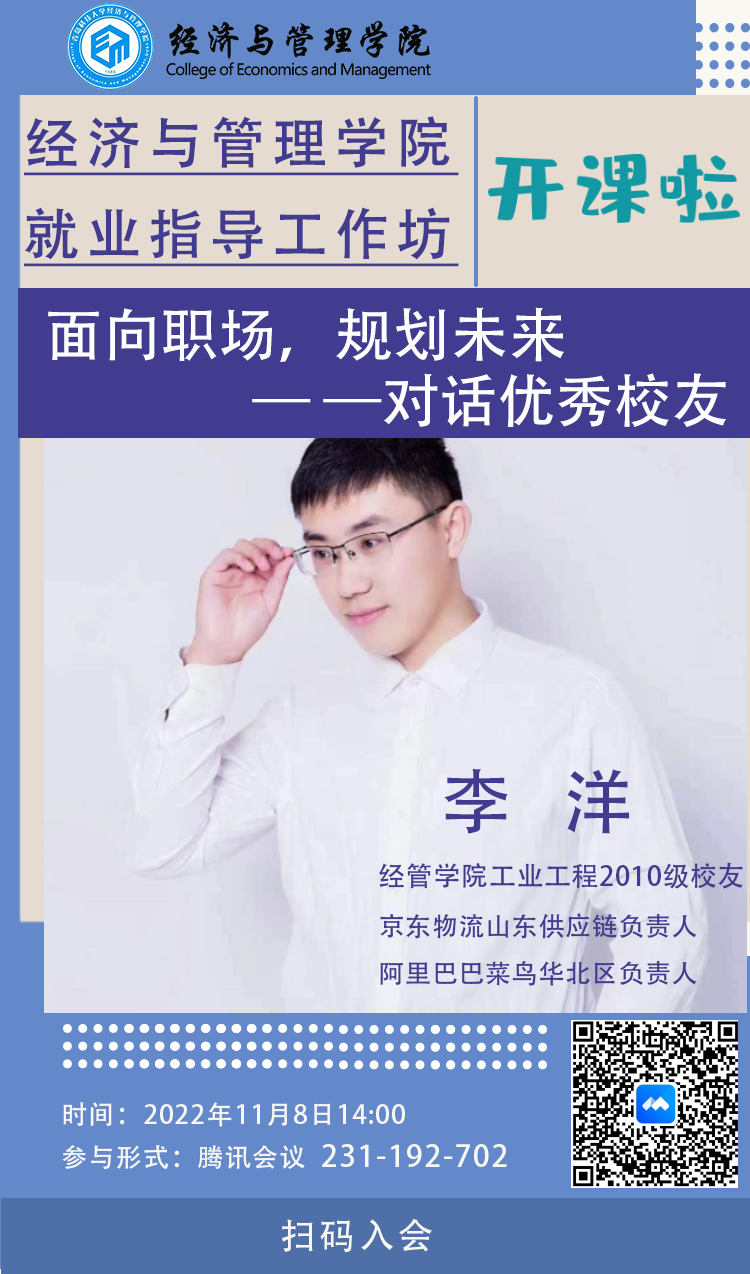 齐心协力抗疫情,就业指导不断线。面对疫情带来的复杂就业形势,9001jcc金沙以诚为本推出“促就业”组合拳,开展就业指导工作坊,助推2023届毕业生高质量就业。11月8日,就业指导工作坊第一讲邀请工业工程专业2010级优秀校友、京东物流山东供应链负责人、阿里巴巴菜鸟华北区负责人、山东速达云仓仓储服务有限公司和山东合聚网络技术有限公司的联合负责人李洋开展《面向职场,规划未来——对话优秀校友》经验分享交流会。9001jcc金沙以诚为本工业工程系主任于龙振,2023届毕业生辅导员孙一君,2023届全体毕业生和部分低年级学生参加会议。