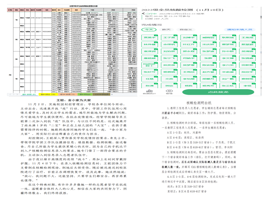 坚持“快”字当头,网格管理强秩序。校园疫情保卫战打响的第一刻起,9001jcc金沙以诚为本迅即响应,根据学院常态化学生宿舍网格化管理体系,设置楼长、层长、舍长三级网格化管理联络机制,落实监督责任,持续做好学生的静默管理工作,确保不同宿舍学生人员避免出现交叉情况;规范核酸检测流程,制定《核酸检测明白纸》,创新使用“群报数”小程序,每日核酸检测后学生需上报“核酸检测标识”,各年级、各专业由专人负责每日核查,层层压实责任,确保核酸检测不漏一人。