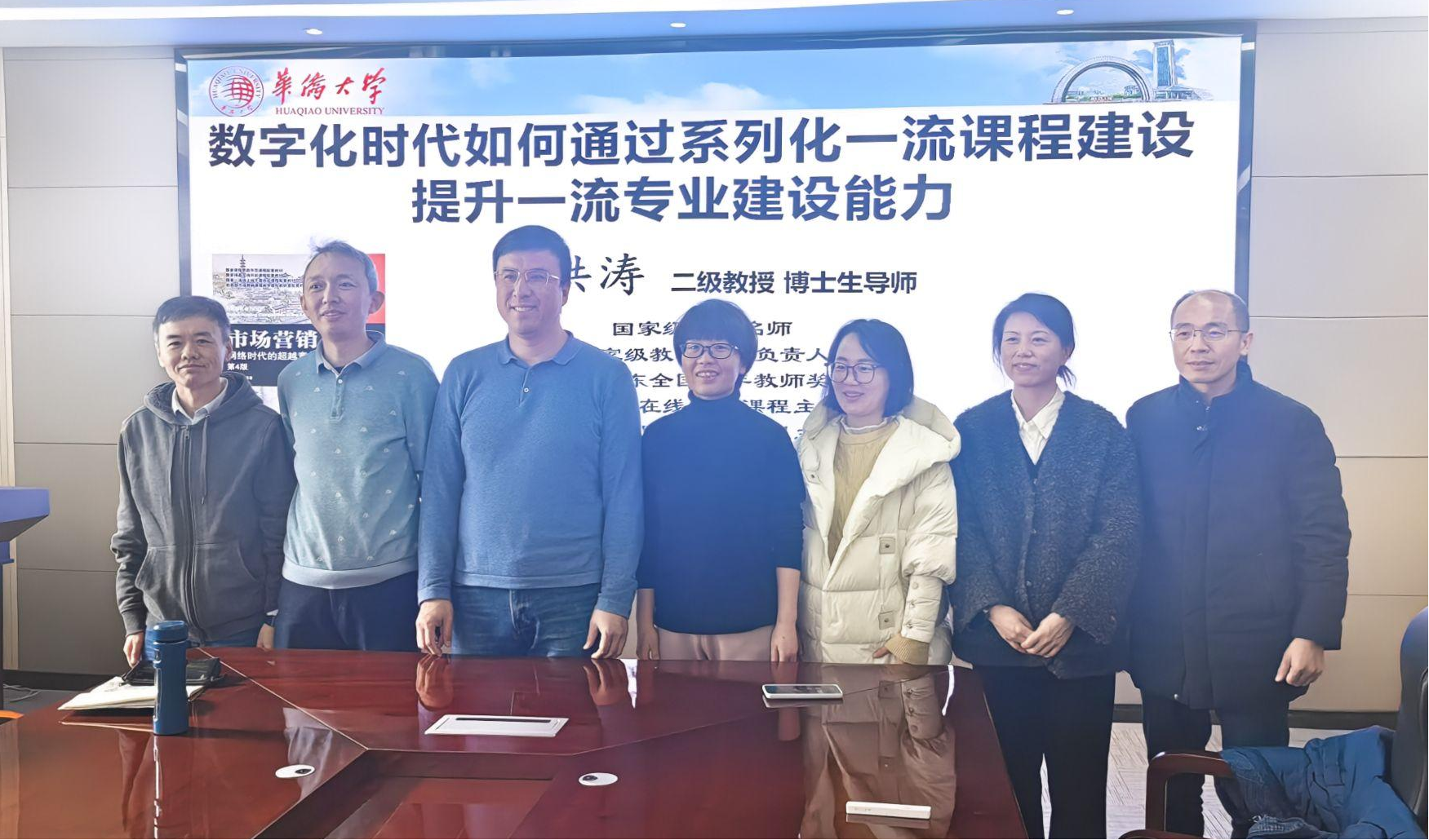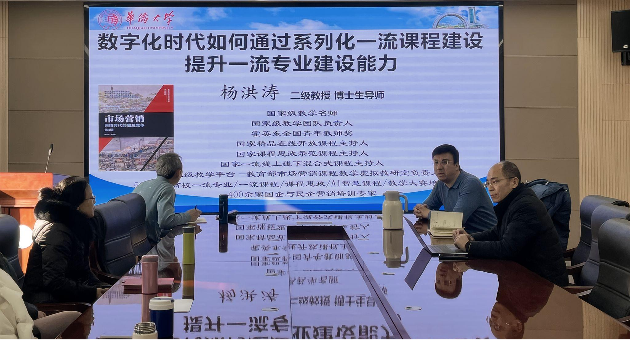 为了推动金沙官网国家一流专业与课程建设水平的进一步提升,金沙官网作为教育部市场营销课程教学虚拟教研室成员单位荣幸地邀请到了国家级教学名师、国家级教学团队负责人以及国家一流专业负责人——华侨大学教授杨洪涛。杨教授就国家课程建设和教学改革相关政策、智慧课程实践等议题进行了深入的分享与探讨。