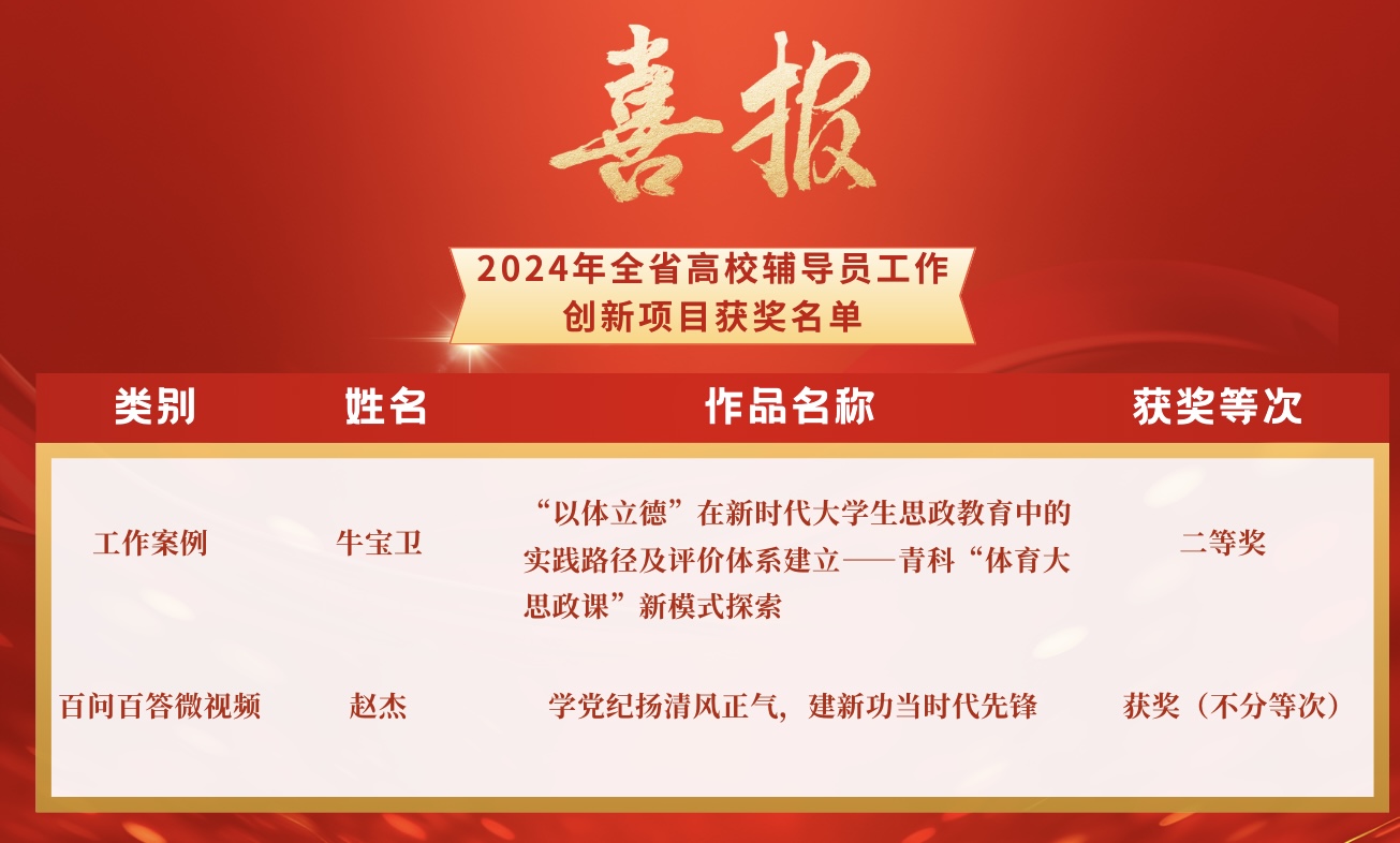 近日,由山东省委教育工委组织开展的2024年全省高校辅导员工作创新项目评选结果揭晓,9001jcc金沙以诚为本报送的工作案例《“以体立德”在新时代大学生思政教育中的实践路径及评价体系建立——青科“体育大思政课”新模式探索》(作者:牛宝卫)获评二等奖,报送的微视频《学党纪扬清风正气 建新功当时代先锋》(主讲人:赵杰)获评优秀百问百答微视频。