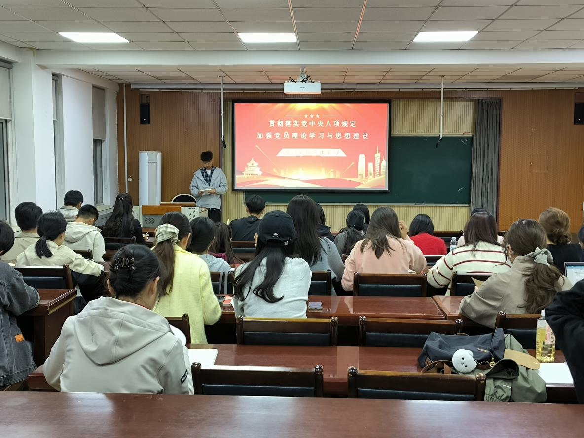会上,张佳欣组织全体与会党员集中观看中央八项规定精神解读微视频。视频内容紧扣制度内涵、精神实质及违纪警示,引导青年党员立足学术科研本职,将落实中央八项规定精神转化为严谨治学、诚信科研的具体行动,坚决抵制学术不端行为,以优良学风筑牢党性修养根基。随后,卢建东带领全体党员逐章逐句研读《习近平关于加强党的作风建设论述摘编》重要论述。学习结束后带领党员重温入党誓词,通过政治仪式教育与原文学习相结合的方式,进一步强化党员身份意识,明确“作风建设永远在路上”的责任担当。刘新悦以《党的作风建设时代内涵与实践路径》为题,从历史经验与时代课题的双重视角,聚焦“从‘豆选法’到‘中巴车’的历史经验启示”及“数字化背景下作风建设新挑战”两大议题,深入剖析党的群众路线发展脉络与当代实践要求。同时她指出,中央八项规定精神与学术研究的严谨性高度契合。支部成员结合自身科研和生活实际,谈学习感悟,提出要抵制浮躁风气,摒弃攀比消费,将“勤俭”“务实”融入学术与生活。