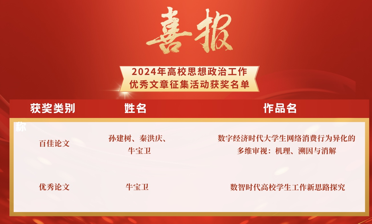 近日,由教育部高校思想政治工作队伍培训研修中心与《高校辅导员》编辑部联合主办的2024年高校思想政治工作优秀文章征集活动评选结果正式揭晓。金沙官网提报的两篇论文从全国1549篇论文中脱颖而出,分别荣获“百佳论文”(第一作者:孙建树)和“优秀论文”(第一作者:牛宝卫)。