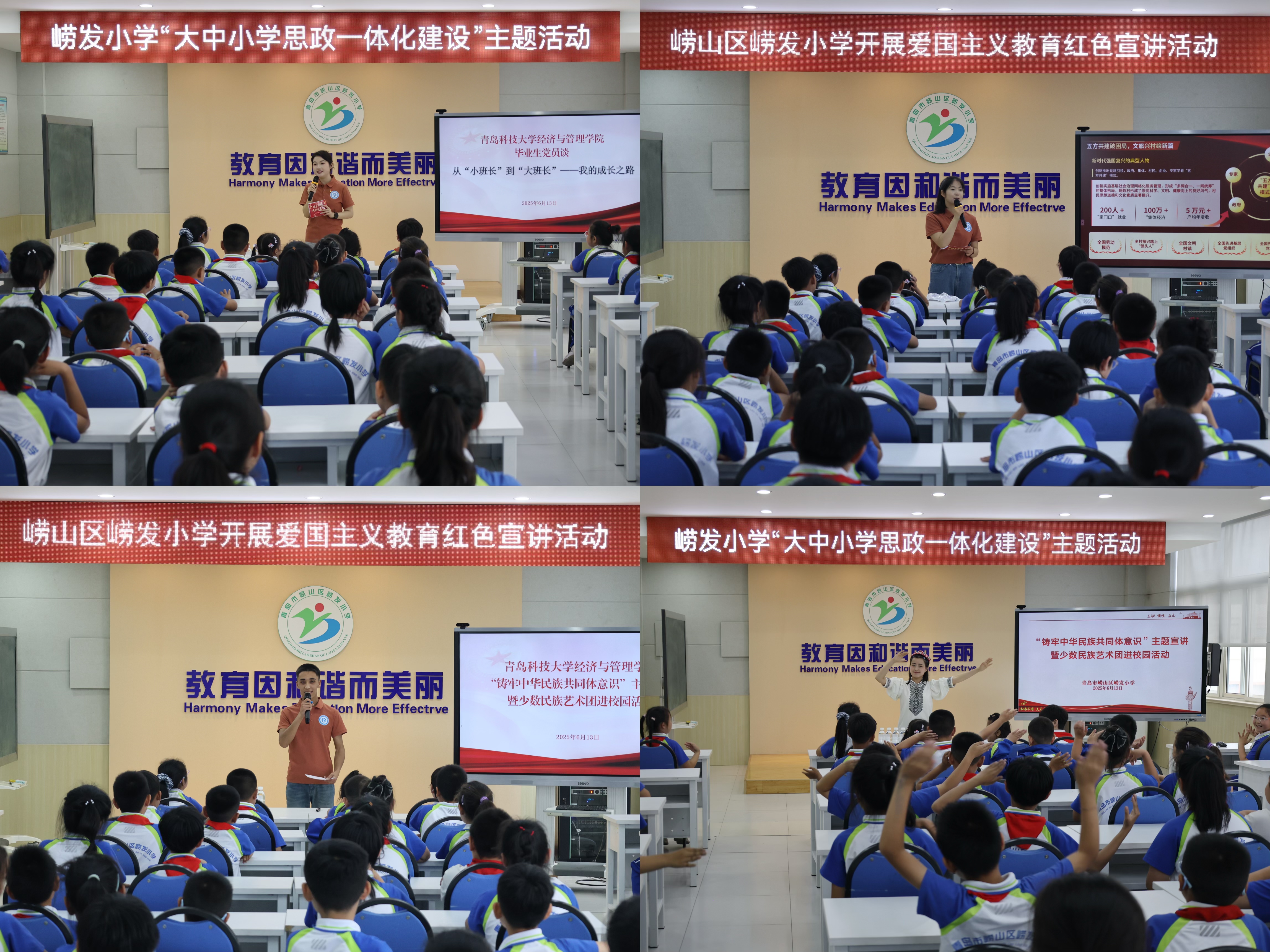 签约仪式后,9001jcc金沙以诚为本学生党员代表与崂发小学学生共同开展“大中小学思政一体化建设”主题活动。毕业生党员代表张一豪向小学生们分享了自己的成长故事,生动诠释了“入队、入团、入党”这一青年追求政治进步的“人生三部曲”,让现场的小学生们深受鼓舞。学院“润心宣讲团”代表吴嘉怡讲述了“从乡村热土到强国征程的奋斗故事”,并向小学生们延伸讲解了“先锋”的含义,号召大家向先锋榜样学习,不怕困难、勇敢前行,努力成长为能够担当民族复兴大任的时代新人。学院少数民族艺术团学生代表依克山·阿布拉提江和米娜瓦尔·艾依热提为小学生们开展铸牢中华民族共同体意识主题教育宣讲,通过故事讲述、舞蹈互动等形式让铸牢中华民族共同体意识在少年儿童心中生根发芽。活动现场气氛热烈,生动展现了党建引领下大中小学思政教育一体化的实践成果。