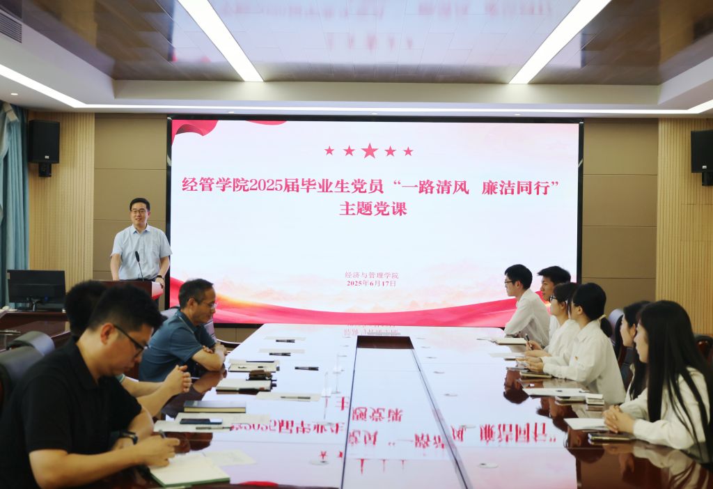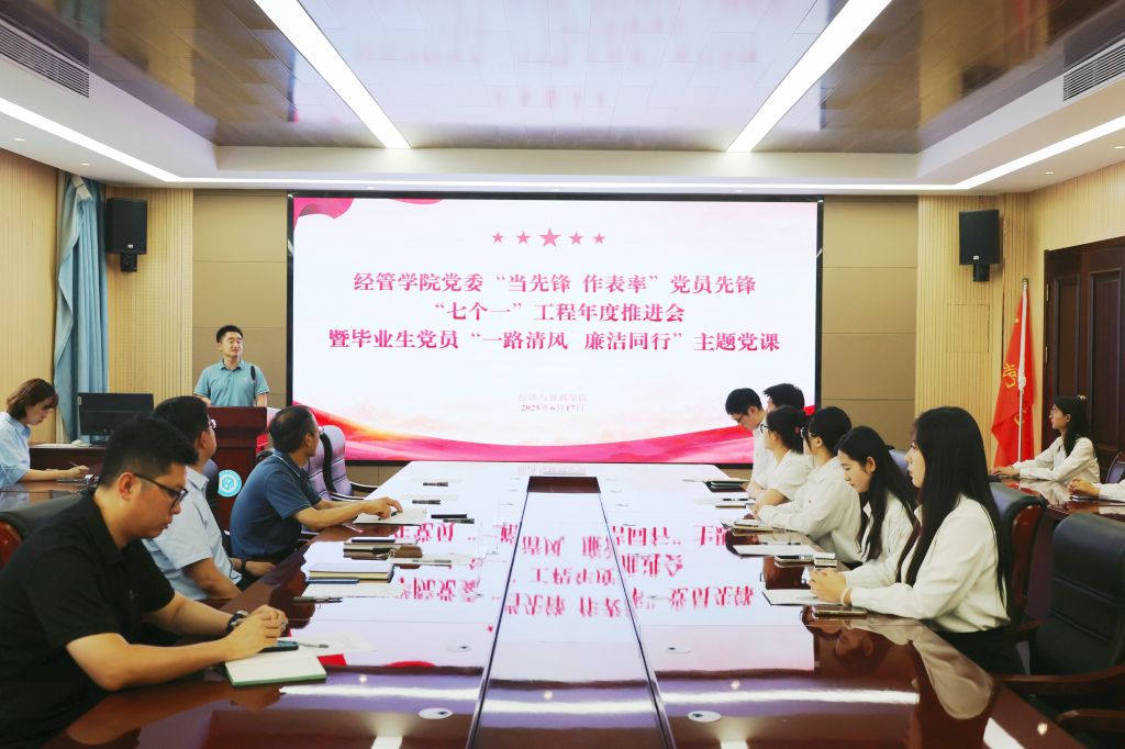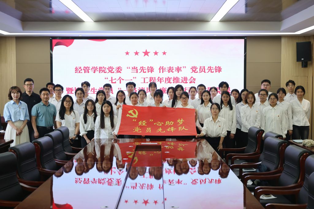 牛宝卫向与会同志介绍了学院党委“当先锋 作表率”党员先锋“七个一”工程的进展成效。他提到,“七个一”工程内容丰富,其所涵盖的党团联动、结对帮扶、志愿服务、选树典型、红色活动等内容对于激励党员在学习、科研、实践中主动亮身份作表率、增强党性修养发挥了巨大作用,自2024年6月启动以来,建设成效显著,形成了具有经管特色的党员教育管理新范式。他强调,这不仅仅是旗帜的交接,更代表着责任与担当的传承,象征着一代代经管党员先锋接力传递的使命,先锋的接力棒将始终在传承中焕发新的光芒。