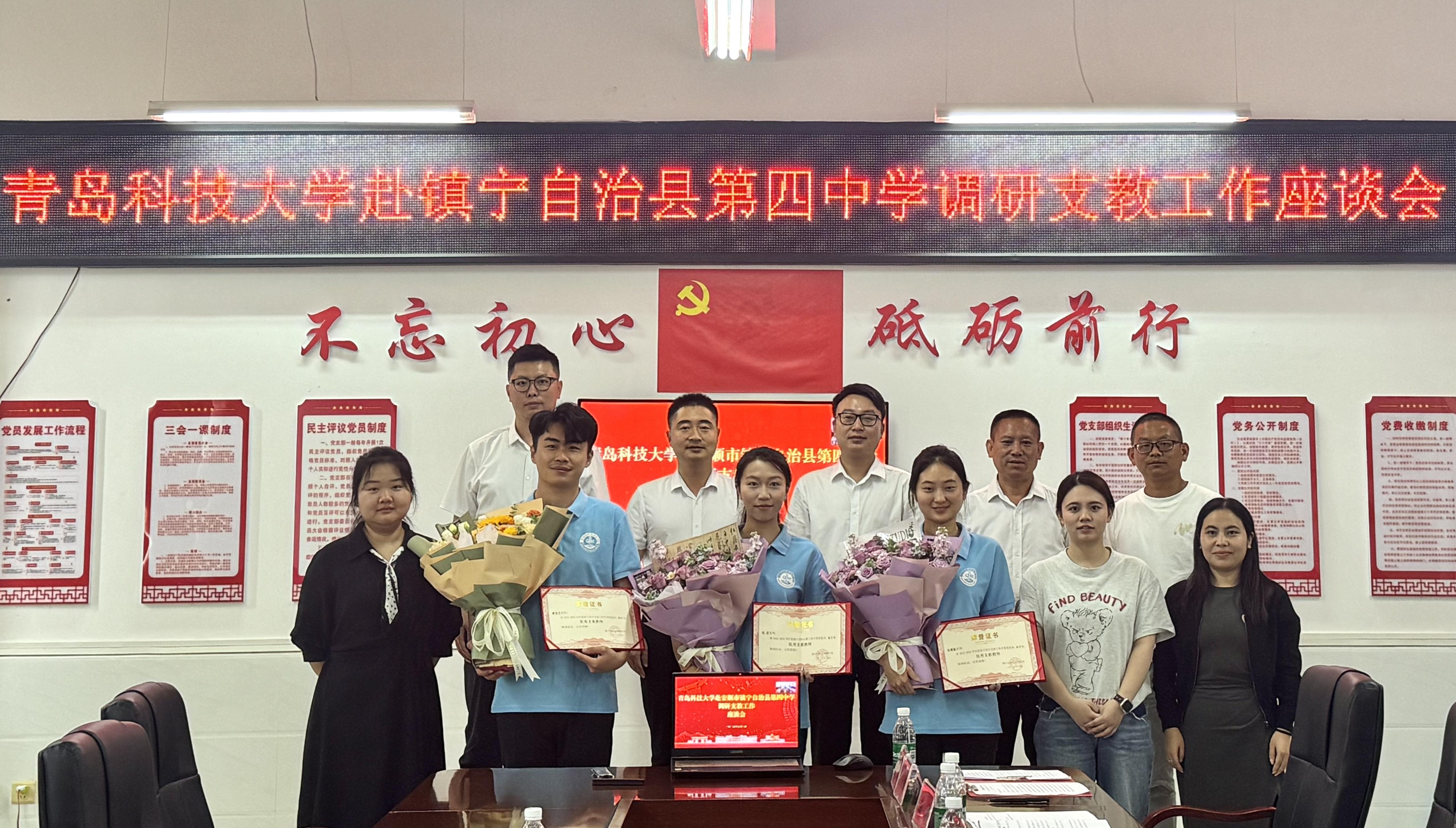 座谈会上,牛宝卫不仅激励研支团成员再接再厉、接续奋斗,发扬“科大精神”,践行“橡胶品格”,打造可持续、展特色、有成效的教育帮扶项目,为祖国西部教育事业的发展注入更多科大青年活力,同时感谢镇宁自治县团委、学校对支教团成员的关怀,肯定了支教团队在教学经验、生活技能等方面的收获,祝福成员圆满完成任务。共青团镇宁自治县委书记王一群向研支团成员一年来扎根镇宁大地、投身教育一线所取得的成绩表示肯定,并勉励成员为镇宁教育事业的发展和进步继续贡献研究生支教团的力量。镇宁自治县第四中学校长沈广书对研支团成员工作表现做出高度评价,为三名志愿者献花并颁发荣誉证书。