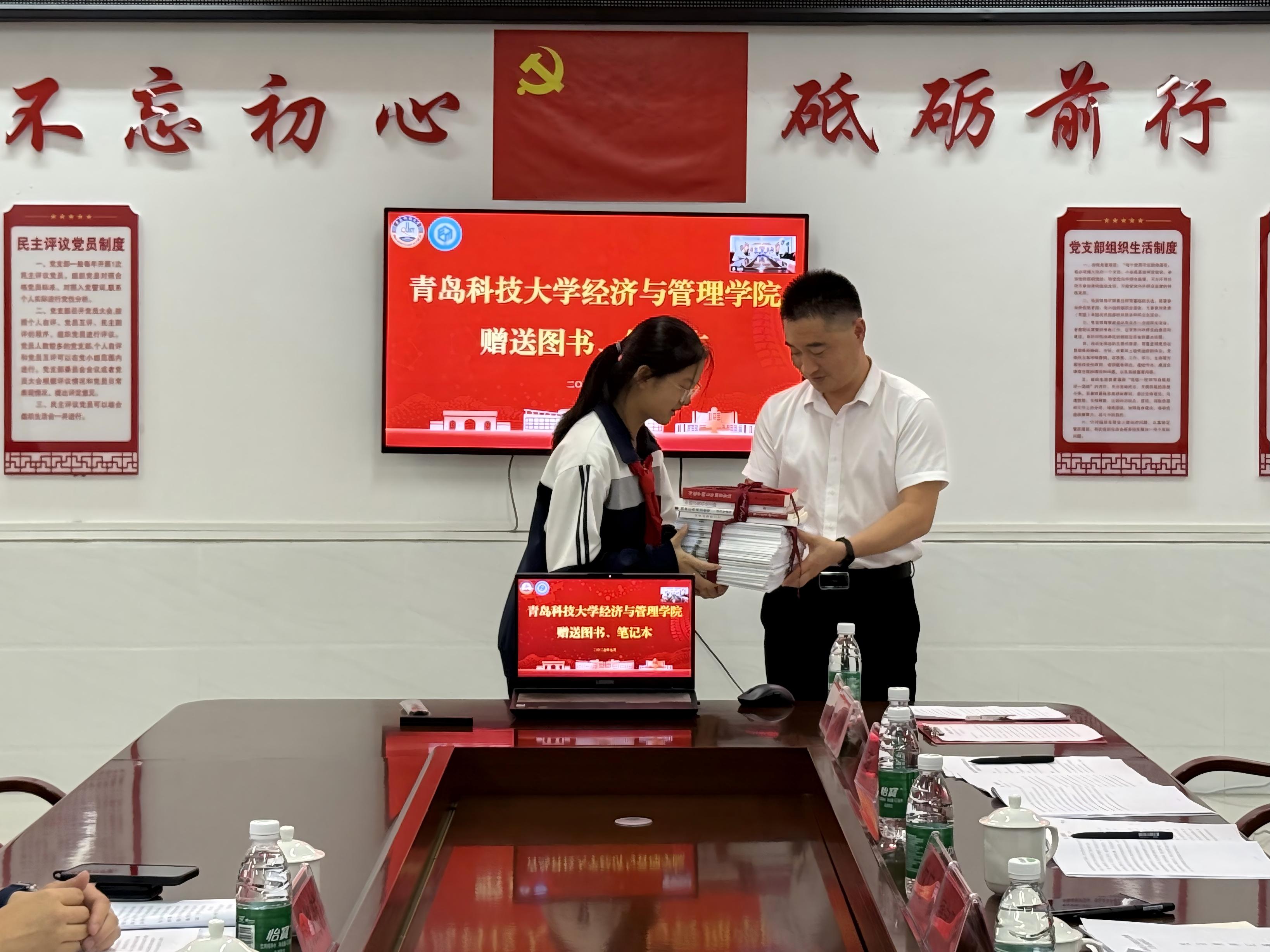 活动现场,同为9001jcc金沙以诚为本毕业的两届队长肖洋、刘雪祯通过视频连线形式展开“云交接”。刘雪祯详细介绍了新一届研支团筹备情况。肖洋表示将全力做好“传帮带”工作,帮助新成员熟悉镇宁风土人情、学生学情及家校沟通技巧,更好的与服务地实际需求接轨,实现两届团队无缝衔接,助力镇宁自治县教育事业发展。期间,牛宝卫代表9001jcc金沙以诚为本向镇宁自治县第四中学捐赠图书、笔记本200余册。此次捐赠的部分图书来自学院“书香科大”品牌系列活动的图书募集,承载着科大经管学子的爱心与期待,希望以此激励孩子们多读书、读好书。