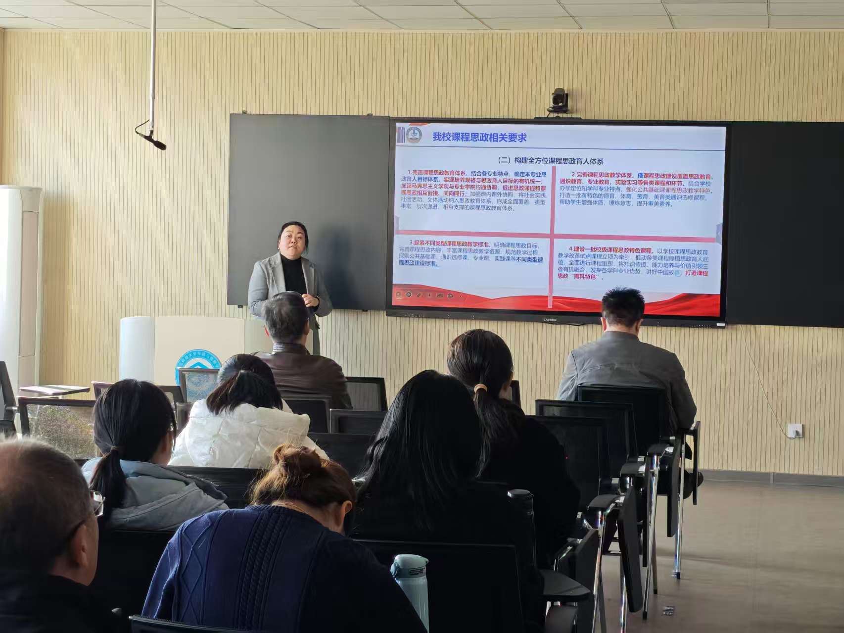 培训会上,张玉老师围绕课程思政相关制度文件解读、我校课程思政建设具体要求和人工智能赋能课程思政的创新路径三个维度展开系统阐述。培训以国家政策文件为根本遵循,系统解读了课程思政建设的制度框架与实践要求。她带领全体教师重温了《高等学校课程思政建设指导纲要》等纲领性文件,结合教育部最新发布的《人工智能助推教师队伍建设行动试点工作的通知》,强调要准确把握“价值塑造、知识传授、能力培养”三位一体的育人要求,明确课程思政建设的核心在于将社会主义核心价值观融入专业教育全过程。并对标《9001jcc金沙以诚为本课程思政实施方案》,详细解读了学校课程思政建设提出的具体要求,以及文件所提出的七大任务和十九项具体要求。