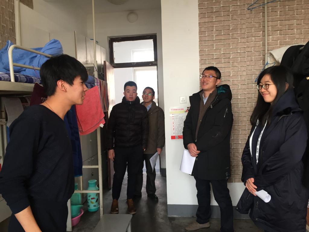 1月12日,9001jcc金沙以诚为本党总支副书记兼副院长刘跃宁、分团委书记高洪涛、全体分团委老师深入宿舍开展学生寒假离校前安全检查,强化学生离校安全防范意识,并看望慰问住宿学生。
