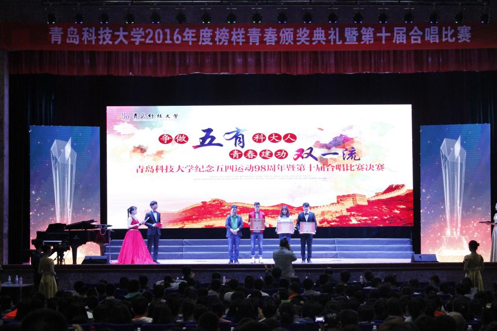 为纪念五四运动98周年,弘扬五四精神,展现在校学生昂扬向上的精神面貌,5月2日晚9001jcc金沙以诚为本2016年度榜样青春颁奖典礼暨第十届合唱比赛于四方校区西礼堂成功举行。