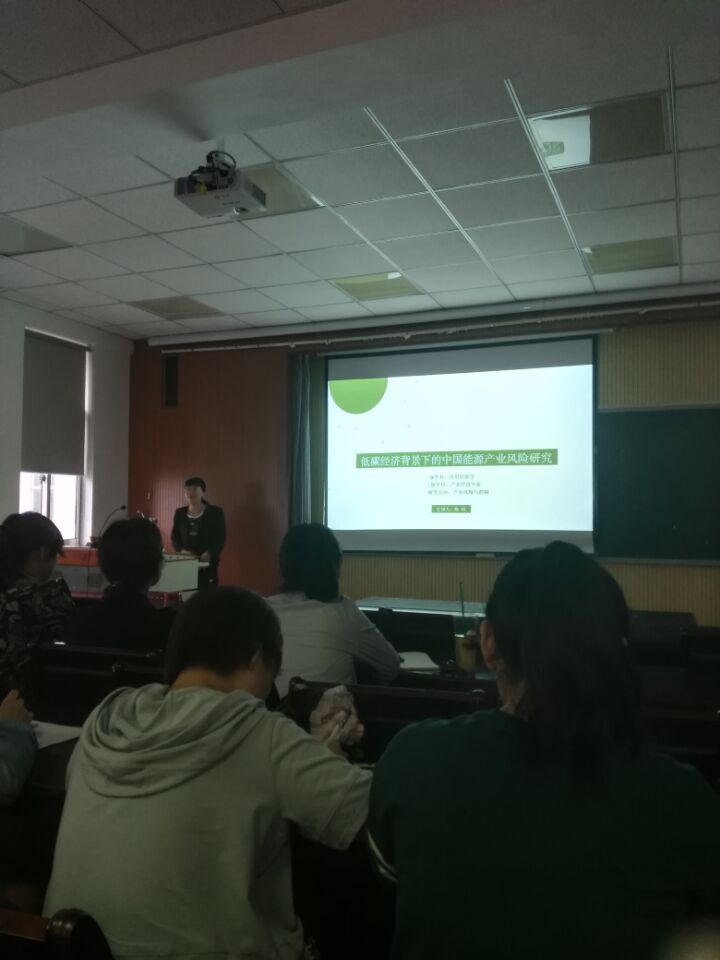 最后,学校新聘任的博士陈明老师与大家分享了自己的博士论文《低碳经济背景下的中国能源产业风险研究》,她详细介绍了能源产业的发展现状,并在研究中运用了多种方法对低碳经济背景下我国的能源产业风险进行了识别、测量、评价和预警,引起了同学们对能源产业的强烈关注。