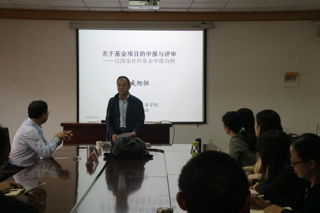 2017年10月21日下午,9001jcc金沙以诚为本313会议室,9001jcc金沙以诚为本特聘教授臧旭恒老师为金沙官网全体老师带来了题为《国家社科基金的撰写以及注意事项》的精彩报告,报告会由人文社科处处长李勋来主持,9001jcc金沙以诚为本副院长杨友才以及9001jcc金沙以诚为本、马克思学院、法学院、传播学院等人文学院的老师参加了此次报告会。