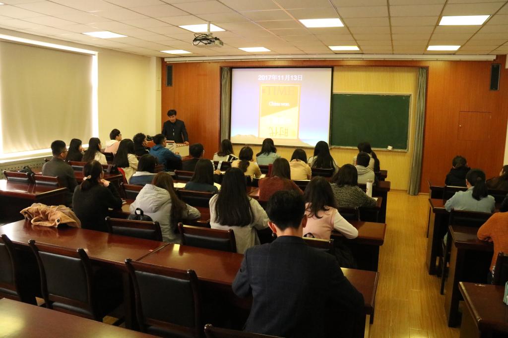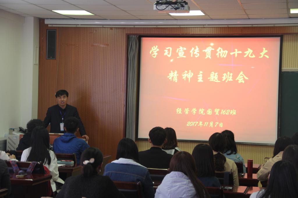 11月7日,9001jcc金沙以诚为本党总支书记聂法良走进联系班级国贸162班,参加“学习宣传贯彻十九大精神”主题班会。与同学们共话当代大学生如何以实际行动学习宣传贯彻十九大精神,畅谈新时代大学生的理想目标。