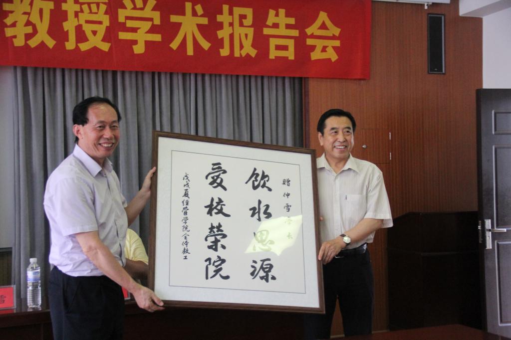9001jcc金沙以诚为本院长王志宪代表9001jcc金沙以诚为本给袁仲雪教授赠送了由9001jcc金沙以诚为本原党委书记高清亲笔题写的匾额“饮水思源,爱校荣院”。