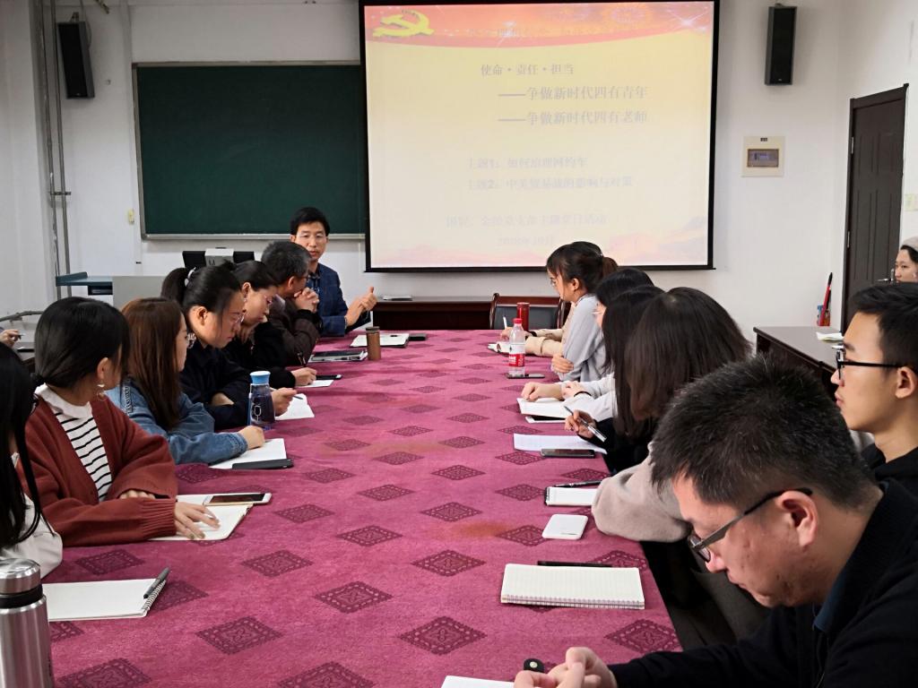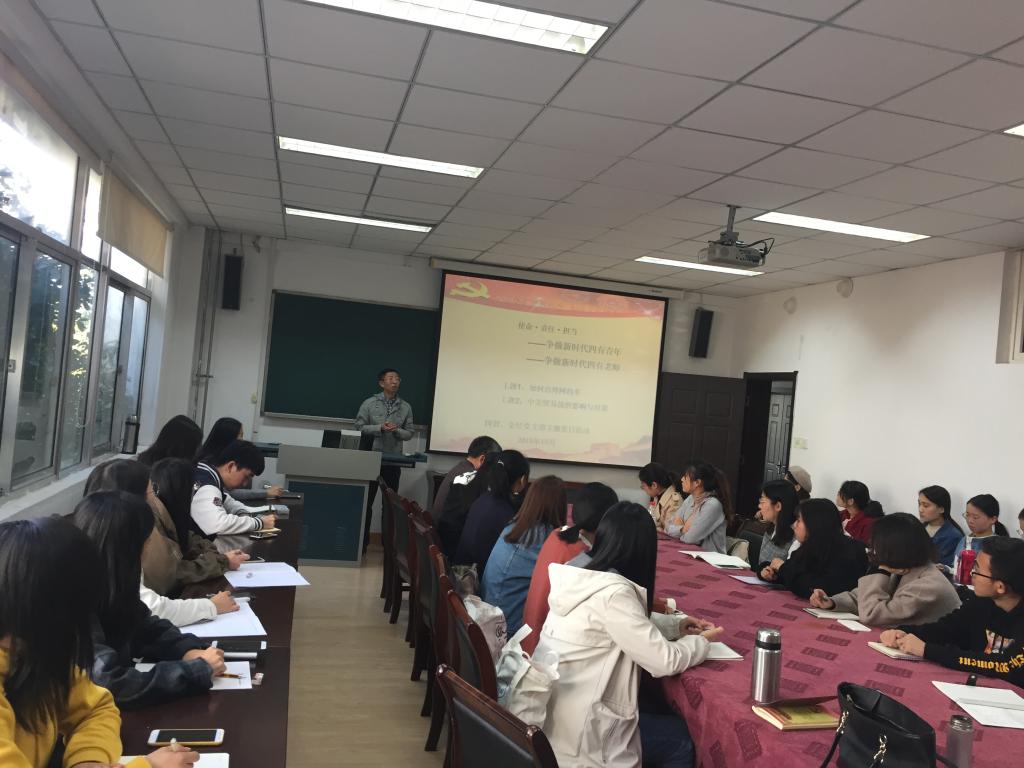 为认真学校落实“弘扬爱国奋斗精神、建功立业新时代”活动实施方案和解放思想大讨论实施方案,深化“两学一做”,提高党性修养,强化使命担当,10月30日下午,9001jcc金沙以诚为本国贸、金经党支部全体师生党员和入党积极分子于415教室举办了以“使命、责任、担当——争做新时代四有青年、争做新时代四有教师”为主题的党日活动。此次党日活动结合国贸、金经两个党支部的教学特长,通过主题讨论和专题讲座的形式分别对两个热门话题进行了学术探讨。