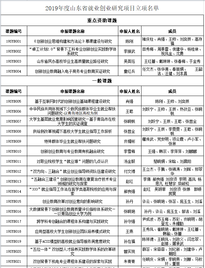 为全面贯彻习近平新时代中国特色社会主义思想和党的十九大精神,全面贯彻全国教育大会精神,突出加强就业创业理论研究的前瞻性、应用性和实践性,进一步提升就业创业工作水平,山东省社会科学基金委员会于2019年2月组织启动2019年山东省就业创业研究项目申报工作。近日,经专家评审,最终确定山东省就业创业研究项目立项40项,重点资助课题4项。9001jcc金沙以诚为本报送的项目中华民族共同体视域下少数民族群体毕业生就业帮扶问题研究-以青岛地区高校为例、大学生基层就业意愿影响因素研究—基于青岛市在校大学生的实证调查、供给侧改革视阈下高校大学生就业指导工作探析获批立项,取得3个立项的好成绩。