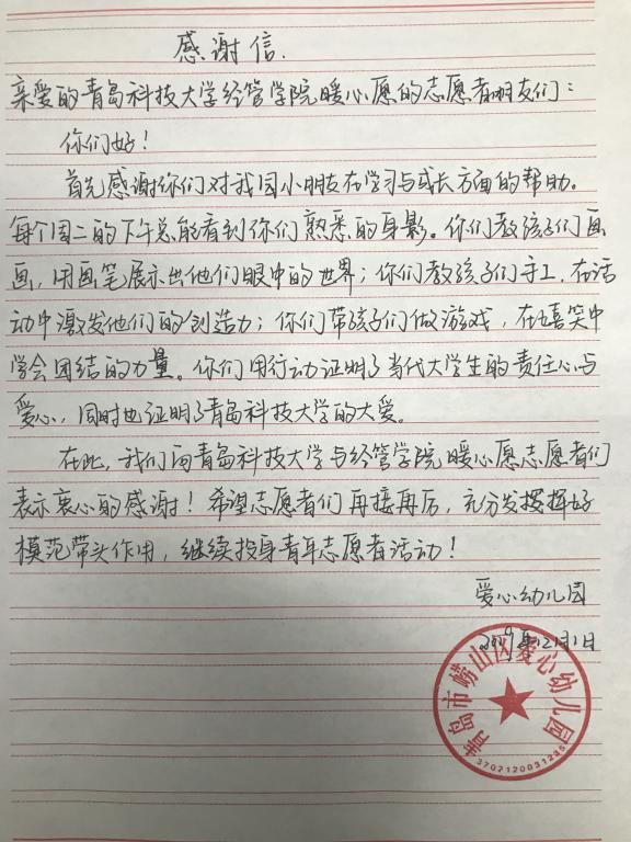 信中特别表扬暖心愿志愿服务团队的志愿者们始终坚守初心,勤勤恳恳、不辞辛苦,坚持为崂山区爱心幼儿园的小朋友们献爱心、送温暖。这封感谢信是对金沙官网志愿服务工作的高度肯定和赞扬,同时也是对志愿者们的认可。青年志愿者协会也将一如既往,更加努力,为学院精神文明建设和需要帮助的群体献出自己的一份力量。