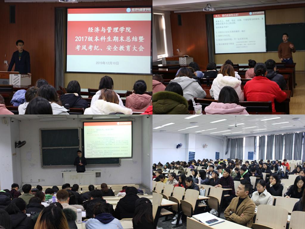 为进一步加强学风建设,严肃考风考纪,提升学生诚信意识,落实学校学院关于期末考风考纪和安全教育的工作要求,12月10日,9001jcc金沙以诚为本2017级本科生于弘毅楼E302室分专业召开期末总结暨考风考纪、安全教育大会。本次大会由17级辅导员张显全老师、马梓轩老师主持,17级全体学生参加。