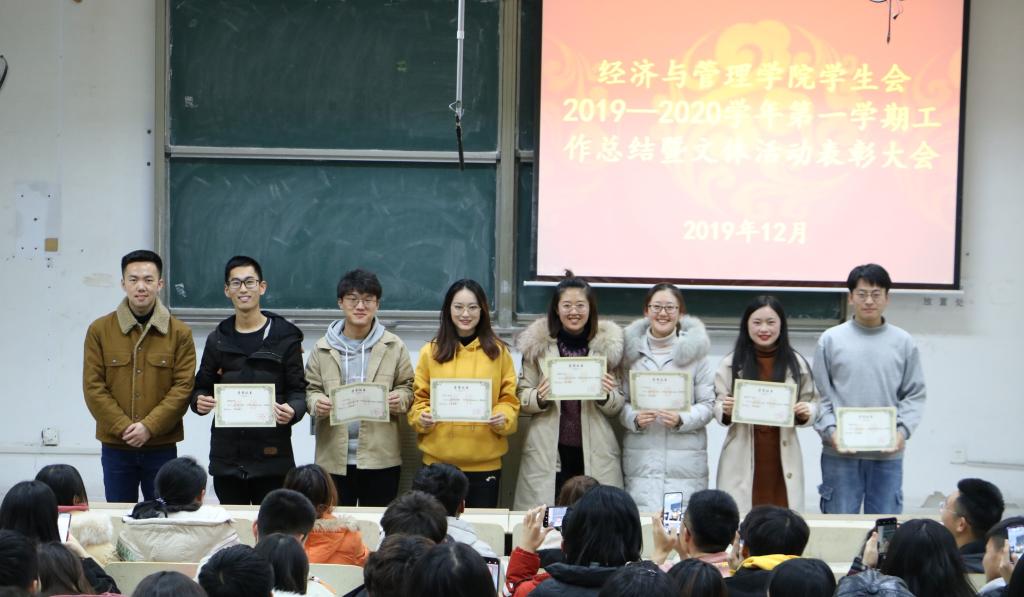 学生会主席肖映彤对年度工作做了总结,肖映彤表示,本学期的学生工作十分圆满,各项赛事成绩都有突破,每位学生骨干都完成了角色转换,得到了锻炼成长。希望学生会全体成员始终以促进学院全面发展为工作中心,紧紧围绕“一心双环”工作要领,坚持“一部主导,多部联动“的活动组织模式,做学生友,不做学生官,走在时代前沿,努力将学生会建设成为能够引领学生思潮的一流学生组织。随后,各部门分管主席依次总结本学期部门工作。最后,高守朋为在本学期各项文体活动中表现突出的优秀个人颁发荣誉证书并合影留念。