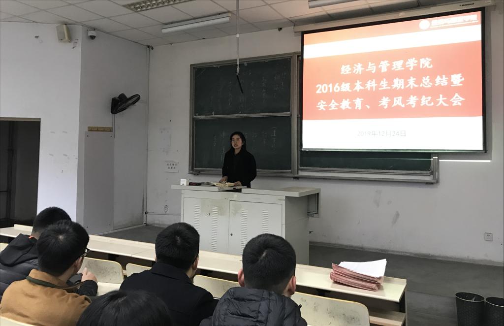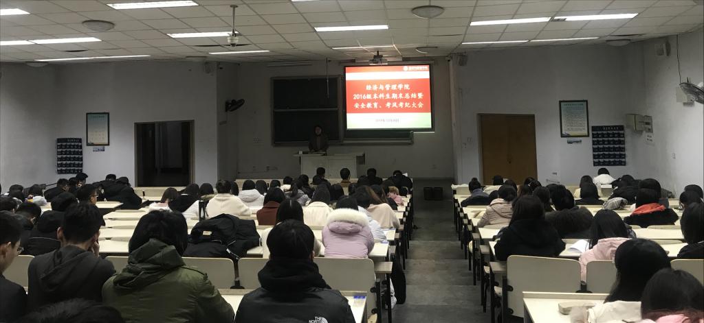为进一步贯彻落实学校、学院关于防诈骗、考风考纪、安全教育、就业指导的工作要求,深入增强学生安全防范意识,巩固提升学院学风建设,12月24日,9001jcc金沙以诚为本2016级本科生于弘毅楼E302室召开期末总结暨安全教育、考风考纪大会。本次大会由16级辅导员王聪、付凯主持,16级全体学生参加。