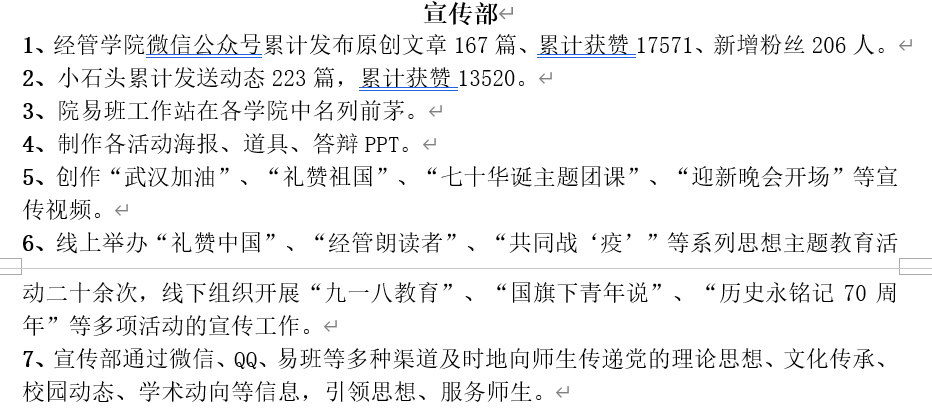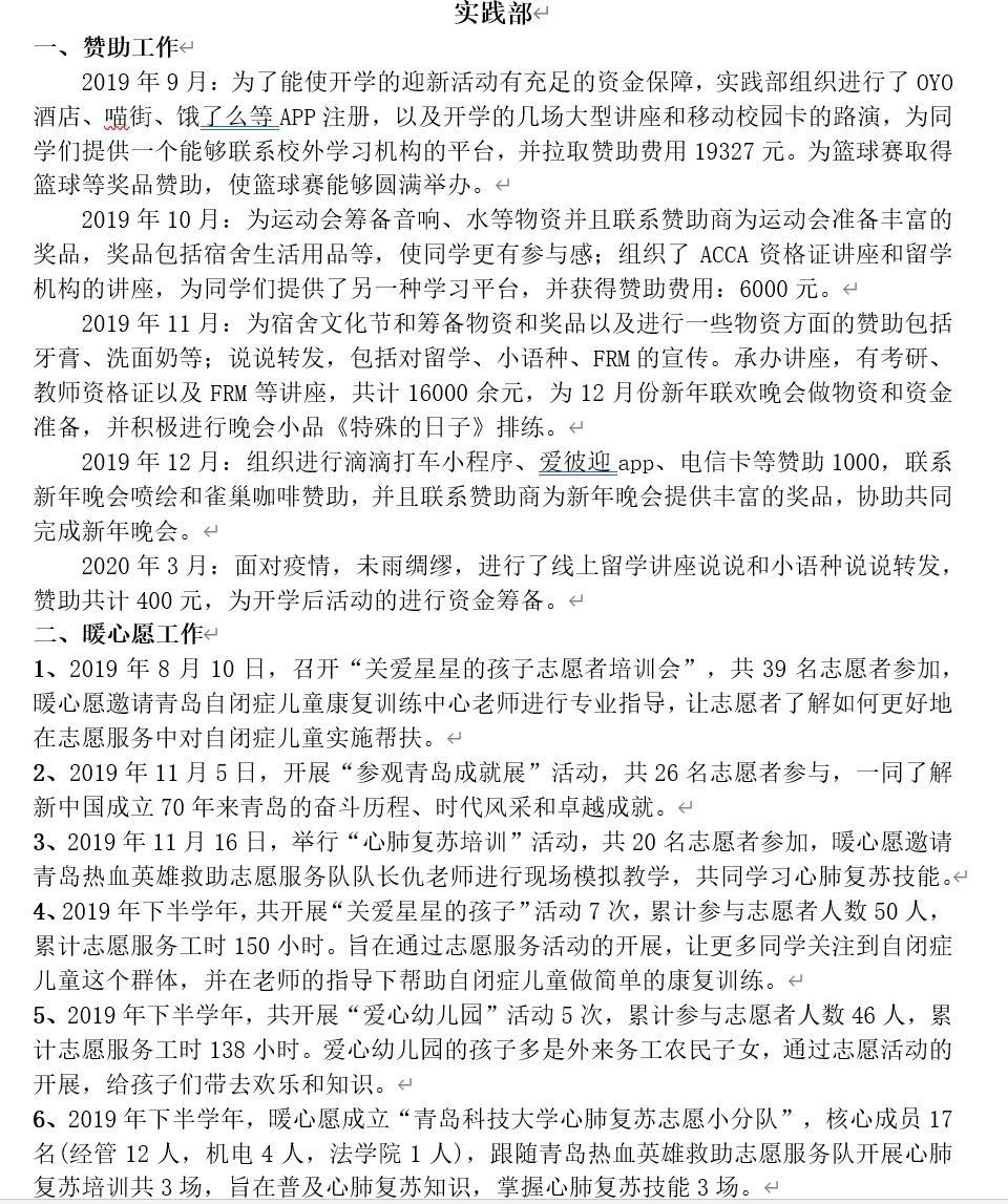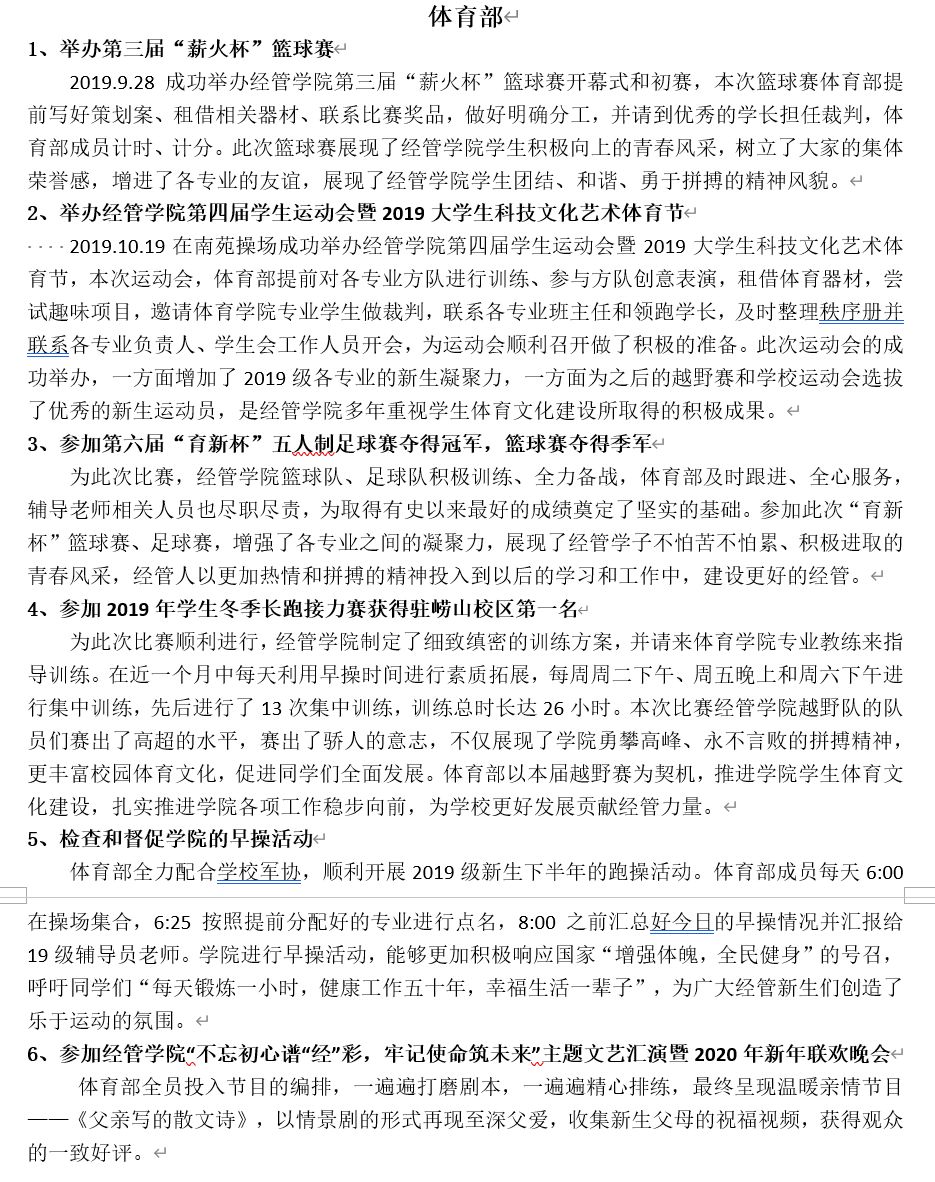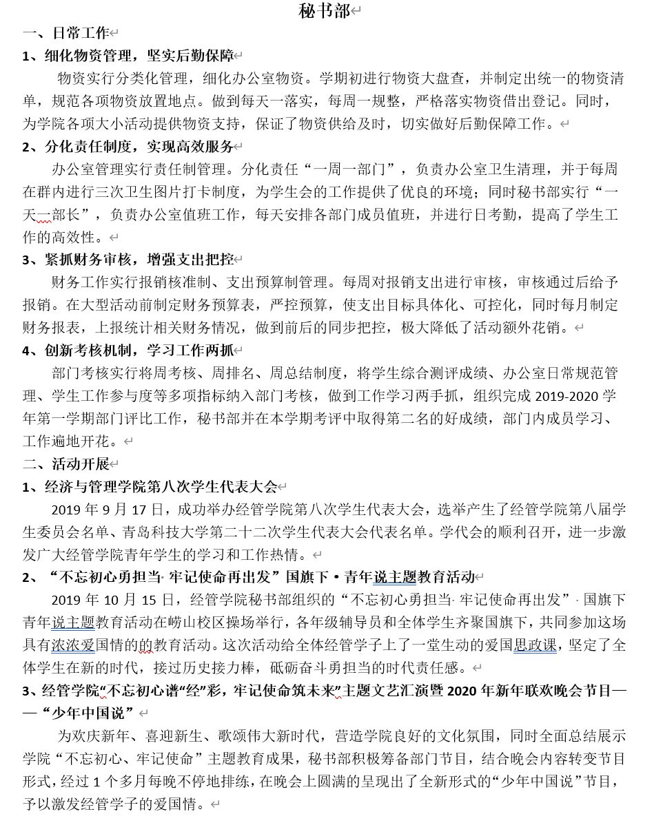 工作考核以部门为单位,分别从工作业绩和部门成员的学业成绩两个方面作为切入点,实行加减分制,结合上学期各个部门在部门建设、部门职能、部门管理等方面的表现进行评比,最终,严格按照部门评比细则,学术部摘得考核桂冠,秘书部和权益部以三分之差分列第二、第三,并授予其“先进工作部门”称号。同时,对于各部门综测成绩在前30%的成员授予“先进工作者”荣誉称号,按照奖罚分明原则,对在部门考核中位于后列的部门及部门成员施之惩罚,以促学生干部正确认识自己,发扬优点,弥补不足,提高工作效率,更好地发挥学生干部作用。