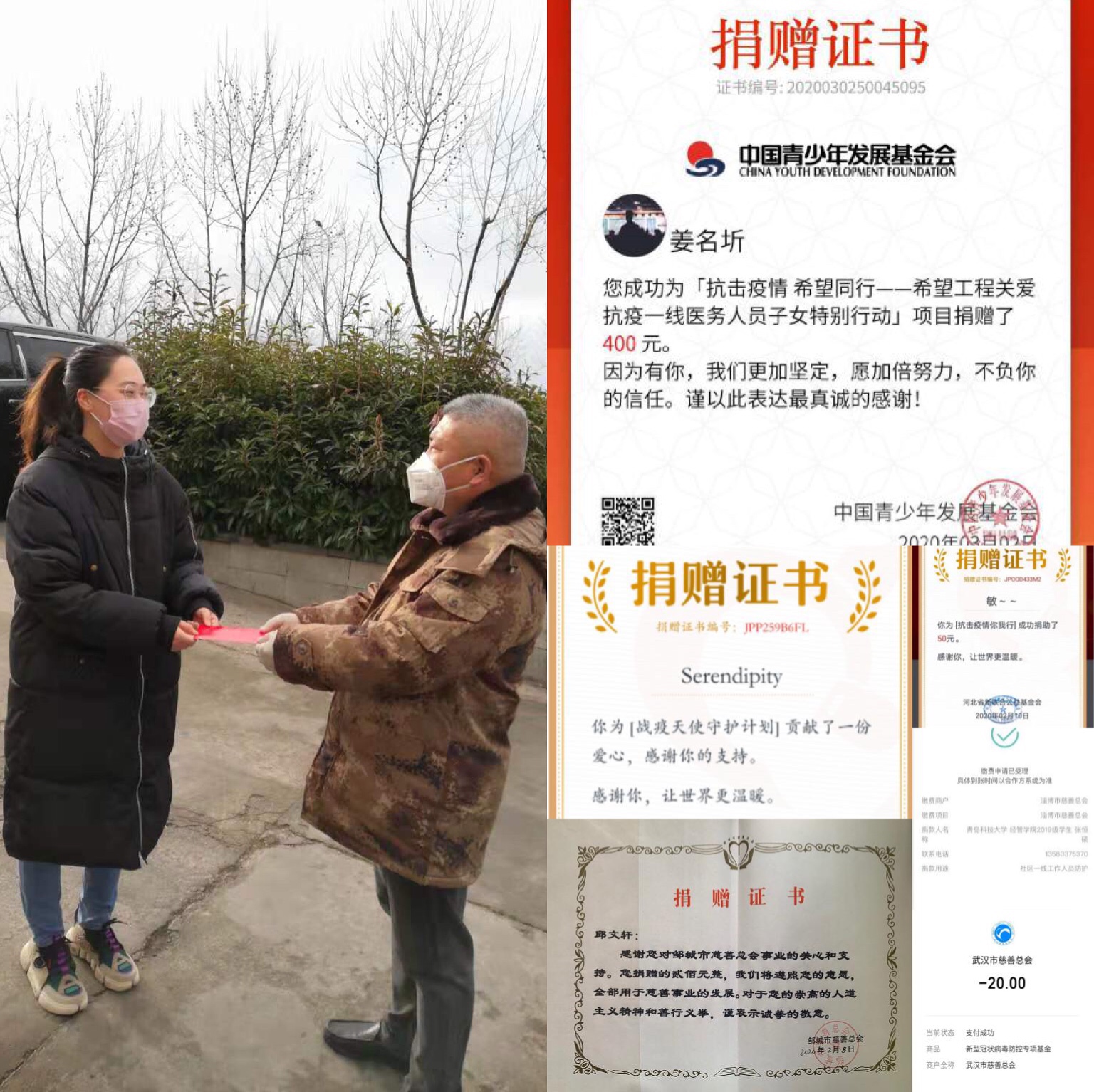 在这场战役中,人人都是参与者,人人都是见证者。财务管理(3+4)161班曲飞、财务181班邱文轩、营销162班韩苗苗、财务192班王心雨、营销192班阚晓敏、ACCA192班张恒硕等同学纷纷通过官方渠道积极参与到疫情防控捐款活动中,为抗击疫情贡献爱心。其中,担任9001jcc金沙以诚为本崂山校区学生会执行委员会主任及城管171班长的姜名圻同学不仅主动捐款500元,并且号召全班同学根据自身情况为抗击疫情自愿捐款,带领同学提高责任意识、增强奉献精神。