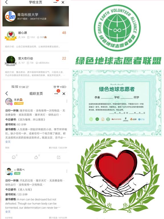 为倡导环保精神,践行绿色发展理念,9001jcc金沙以诚为本暖心愿爱心公益团队于3月12日植树节,组织开展“绿色地球”线上志愿活动,鼓励大家进行每日读书打卡,交流学习心得,并积极传递环保理念,每天分享生活中的环保小方法。随着活动的推广,其他社团也纷纷响应号召,活动期间,暖心愿共召集三百多位成员,累计两千条读书心得及日行一环保打卡记录,展现了当代青年学生应有的使命感、责任感。