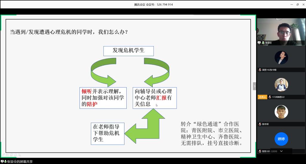 疫情期间,为进一步完善学校、学院、班级、宿舍“四级”心理危机预防联动机制,提高朋辈助人、自助能力,提升学生获得感、幸福感、安全感,充分发挥“心音使者”在心理健康工作中的重要作用,4月21日下午3点,9001jcc金沙以诚为本借助腾讯会议平台举办“心音使者”线上培训会,学院心理工作站王聪、张显全担任主讲老师,2016级、2017级、2018级共计285名“心音使者”参加了培训。