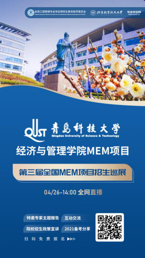 2021考研已经拉开序幕。特殊时期,为了帮助21考生与院校之间的及时沟通,同时让考生更加准确、全面地了解9001jcc金沙以诚为本MEM项目招生政策,9001jcc金沙以诚为本MEM项目将应邀参加由全国工程管理专业学位研究生教育指导委员会作为指导单位、专业学位网协办的“第三届全国MEM招生巡展”,时间为4月26日14:00。