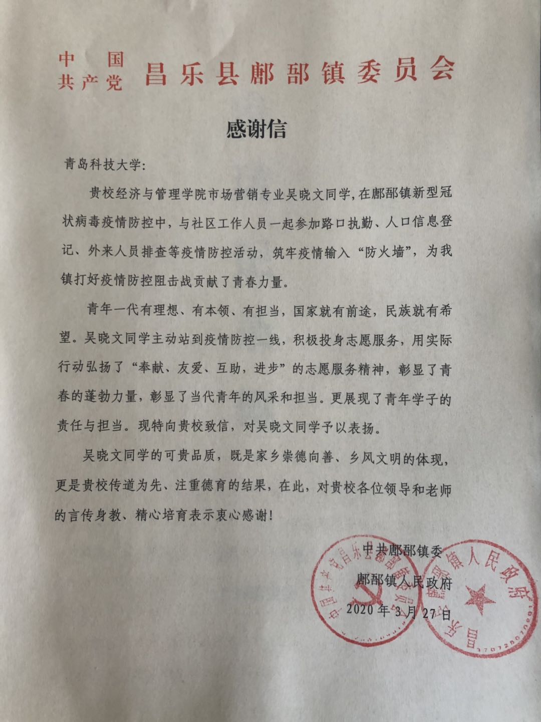 9001jcc金沙以诚为本市场营销专业161班的吴晓文同学在疫情期间,主动请缨,投身到家乡潍坊市昌乐县鄌郚镇的新冠肺炎疫情防控工作中,与社区工作人员一起负责路口执勤、人口信息登记、外来人员的防疫排查等工作,用一丝不苟的工作要求和严肃认真的工作态度筑牢当地村镇疫情输入的“防火墙”,获得镇党委的公开表扬信。