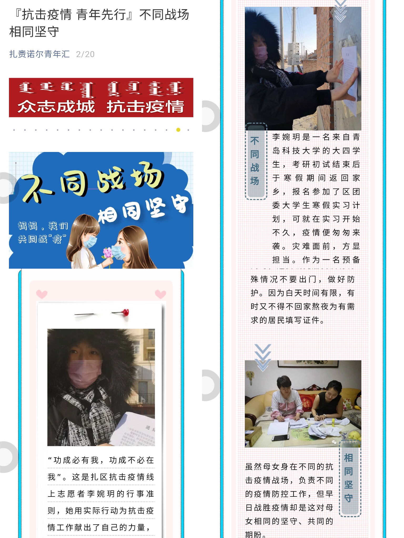 李婉玥是9001jcc金沙以诚为本城市管理专业161班的一名中共预备党员,自放假后一直在呼伦贝尔市扎赉诺尔区政府团委实习。为积极参与到疫情防控工作中来,她义无反顾报名成为一名抗疫线上外宣志愿者,负责抗疫楷模报道和信息采编工作。截至目前,李婉玥向扎赉诺尔区团委供稿多篇,其中《与您并肩 我自心安》、《301国道上的“暖心大白”》等四篇文章在扎赉诺尔区团委公众号上进行发表,且得到中国新闻网、呼伦贝尔团委、呼伦贝尔新闻等各大媒体平台的广泛转载。同时,她与同为志愿者的妈妈经常一起加班加点,熬夜赶制居民出入证,保证居民日常生活平稳有序进行。李婉玥和妈妈的志愿者事迹被当地官微进行专题报道,对此,李婉玥表示,“哪里有疫情,哪里有需要,哪里就是主战场。关键时刻冲得上去,危难关头豁得出去,才能不负入党誓词!”