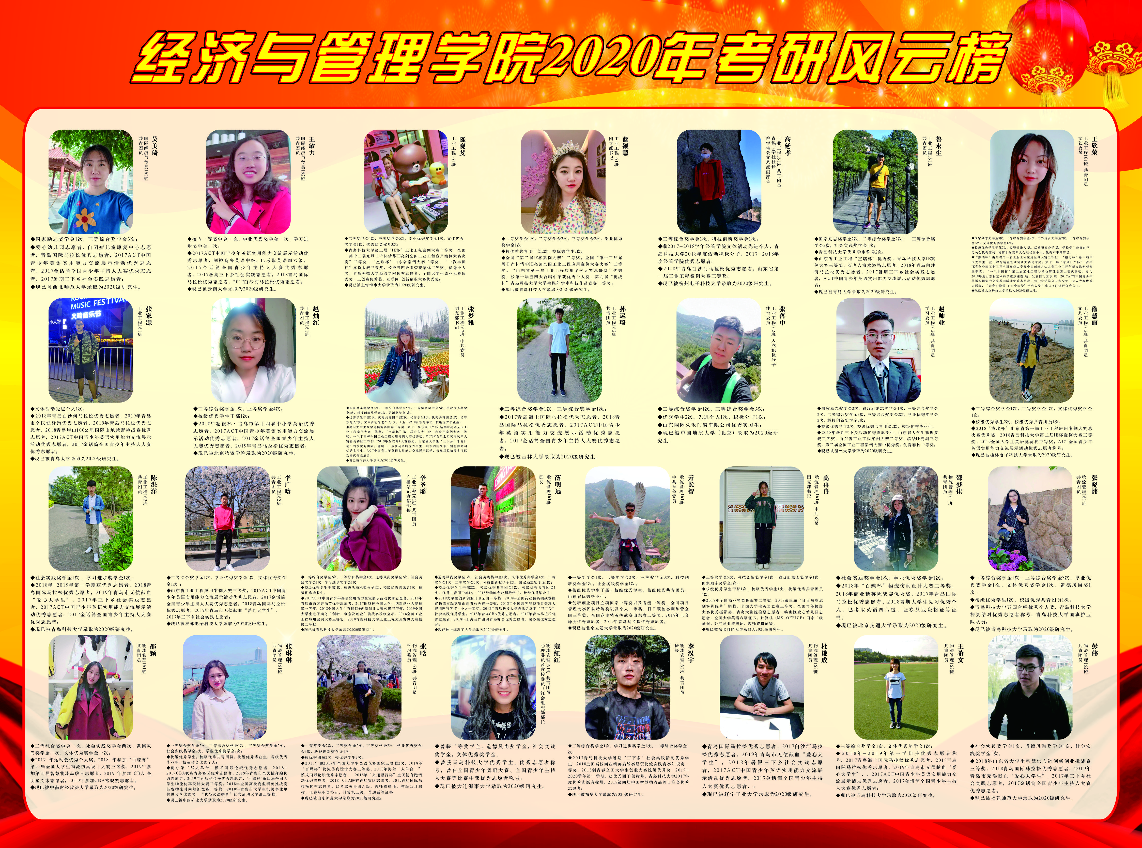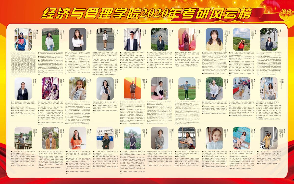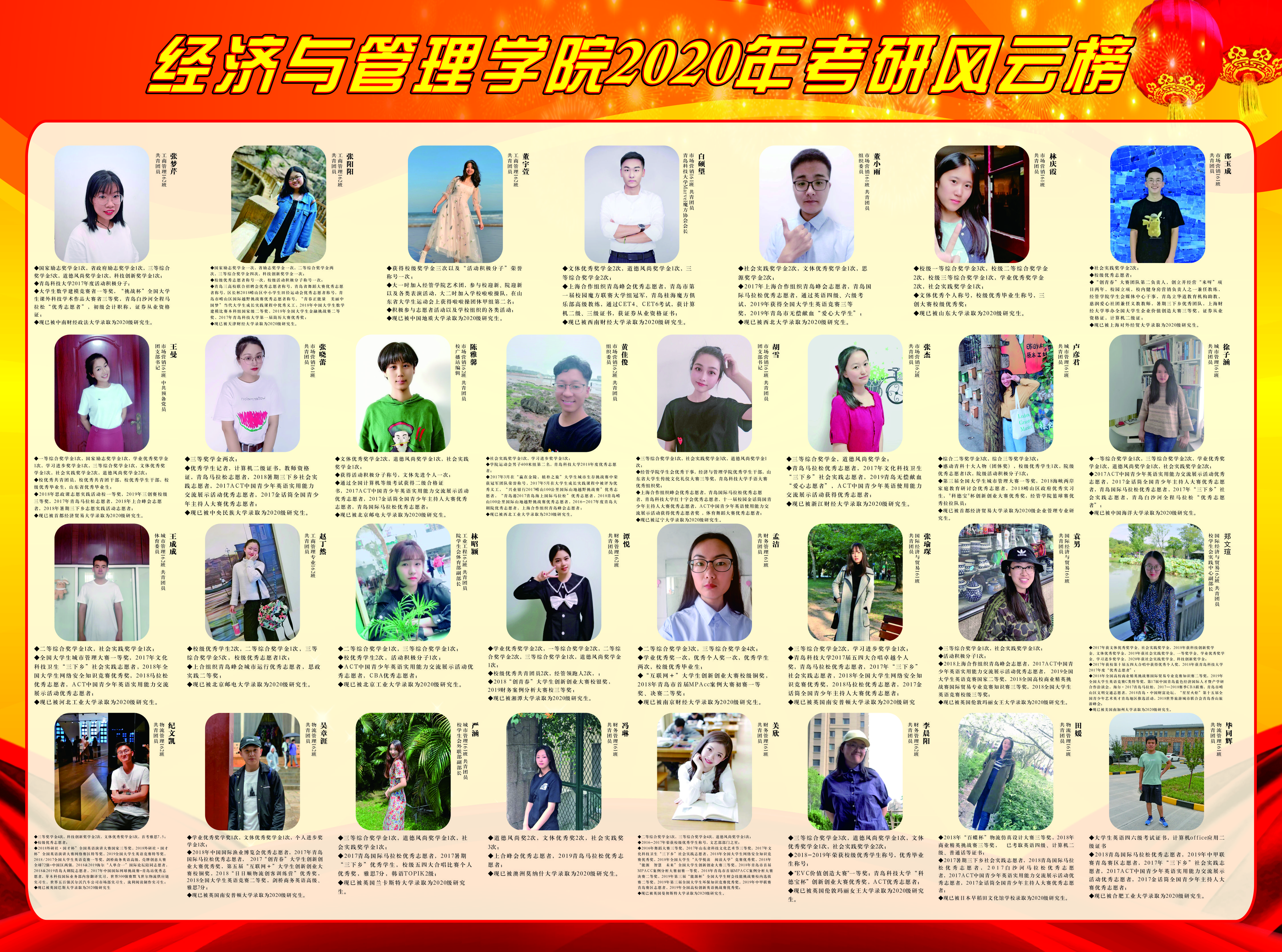 日前,2020年全国硕士研究生招生录取工作落下帷幕,金沙官网考研喜报频频传来,在全体师生的共同努力下,金沙官网的考研工作较之以往又上新台阶。据统计,国内外升学最终录取人数122人,双一流高校录取人数58人,总考研率达24.94%,较去年提升近5个百分点。其中,国际经济与贸易专业考研率37.5%,工商管理专业考研率14.71%,财务管理专业考研率23.97%,工业工程专业考研率30.51%,城市管理专业考研率10.34%,市场营销专业考研率19.35%,物流管理专业考研率40.35%。为进一步夯实学院学风建设,树榜样,立标杆,营造浓厚学术氛围,特推出“考研风云榜”展示活动,具体如下: