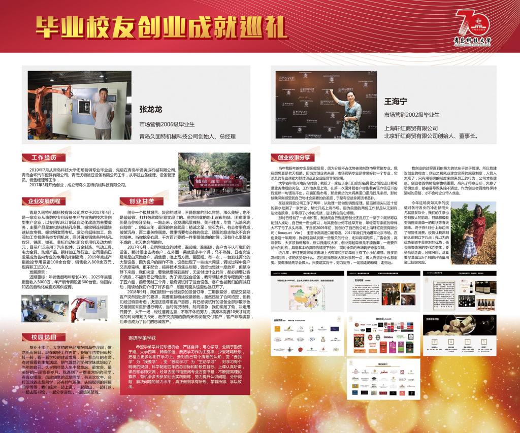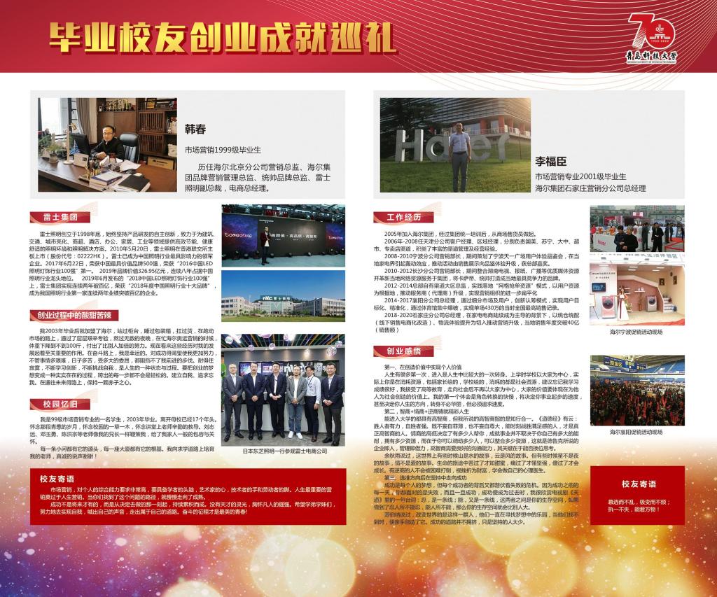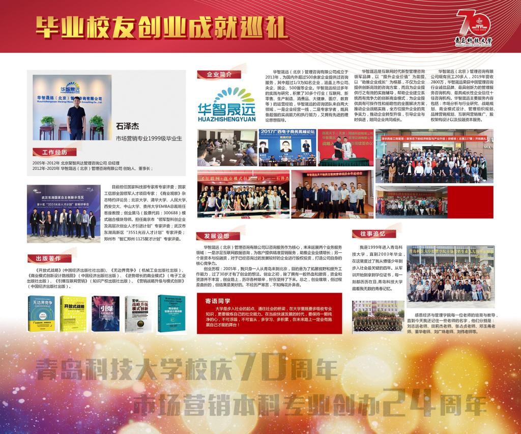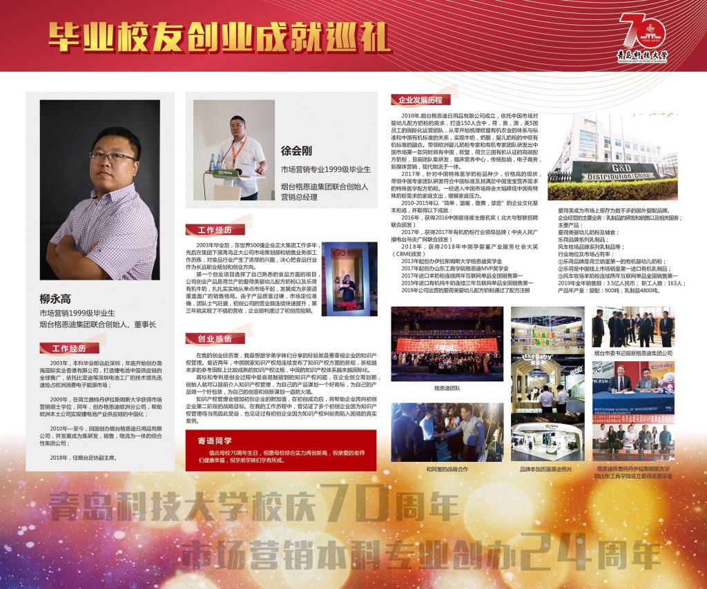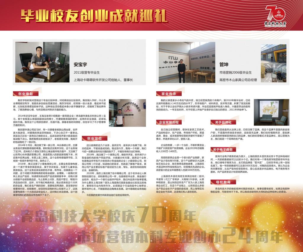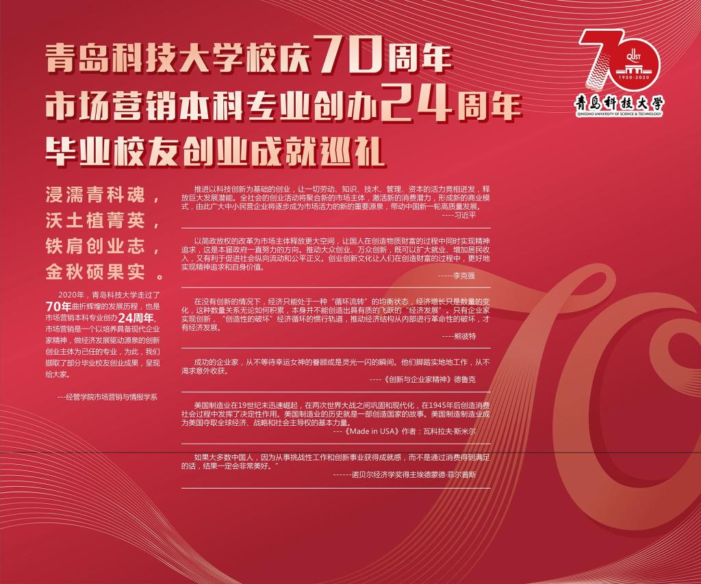 值此校庆70周年之际,金沙官网市场营销本科专业创办满24周年,为此,9001jcc金沙以诚为本市场营销系举办了毕业校友创业成就展览,收集了历届校友创业创新活动取得杰出成就的部分素材,制作展览栏于弘毅楼门口进行集中展示。