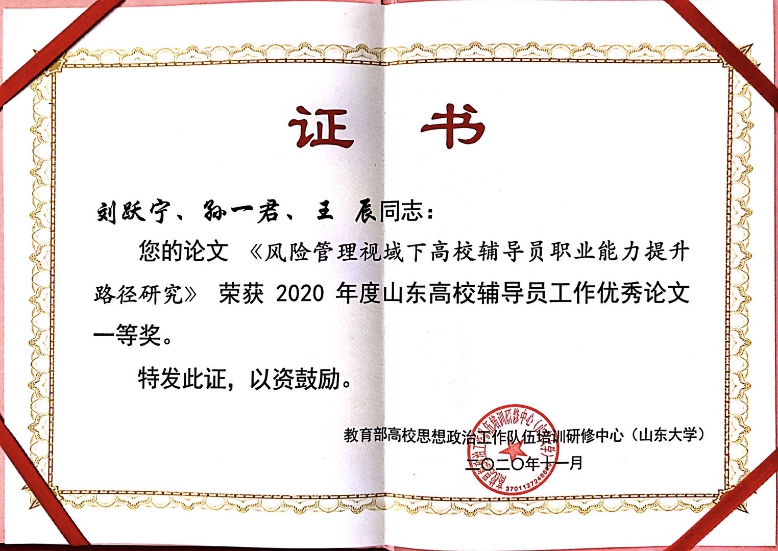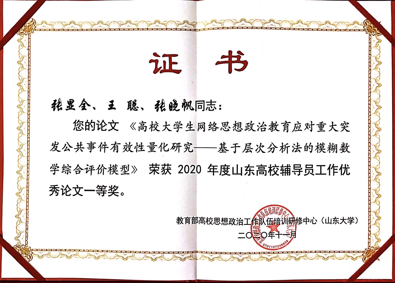 论坛对2020年山东高校辅导员工作论坛获奖论文进行了表彰。全省200余所高校(含高职)推荐的1000余篇论文共有97篇论文获奖(其中一等奖20篇,二等奖33篇,三等奖44篇)。学校共有3篇论文获奖(其中一等奖2篇、二等奖1篇),由金沙官网刘跃宁、孙一君、王辰撰写的《风险管理视域下高校辅导员职业能力提升路径研究》,张显全、王聪、张晓帆撰写的《高校大学生网络思想政治教育应对重大突发公共事件有效性量化研究——基于层次分析法的模糊数学综合评价模型》两篇论文获得一等奖,获奖数量和质量均有重大突破。