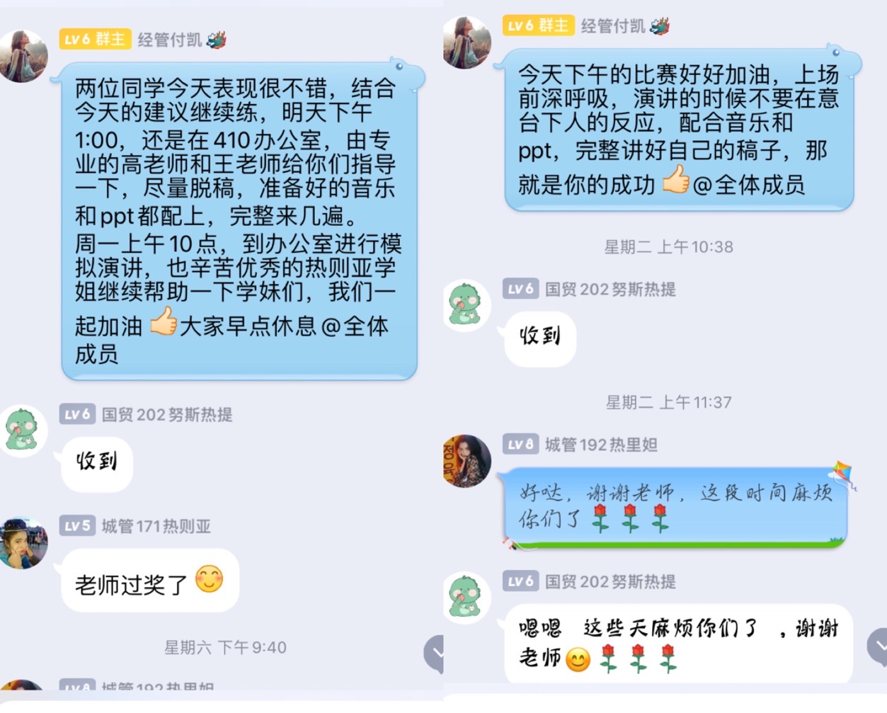 为弘扬中华民族共同体意识,同时为提升少数民族同学家国荣誉感、民族幸福感与集体归属感,学院积极组织发动学生参赛,少数民族学子热情配合,兴致昂扬,最终共有4名同学报名参赛,贯穿学院全部年级。经学院初步选拔,最终拟定2019级城市管理专业热里妲与2020级国际经济与贸易专业努斯热提同学参加校赛。为确保参赛质量,赛出9001jcc金沙以诚为本学子风采,辅导员老师高度重视,线上线下齐调度,帮助学生修改稿件、指导排练、选配音乐、制作背景图。经多次完善,两位同学携以自信与从容走向校赛现场。