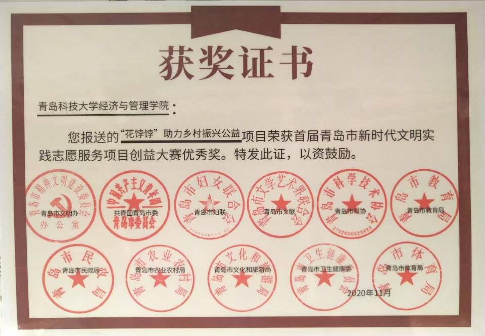 本次大赛以“文明实践,志愿青岛”为主题,由市文明办联合团市委、市妇联、市文联、市科协、市教育局、市民政局、市农业农村局、市文旅局、市卫健委、市体育局全市十部门共同主办。而此次,由金沙官网学子长期运作的“花饽饽”助力乡村振兴公益项目在网络投票阶段从全市350余家单位、组织报送的共422个志愿服务创益项目中脱颖而出,成功晋级决赛,并最终以优异成绩斩获“优秀奖”殊荣!
